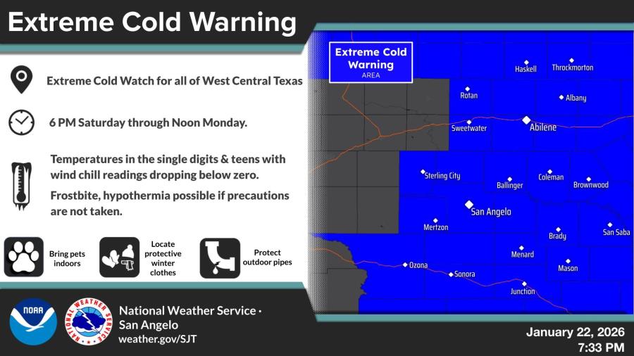San Angelo: High near 57 Friday afternoon, falling to 29 by midnight, with lows in the teens to low 20s Saturday night through Monday morning. Wind chills could reach -1 early Monday.