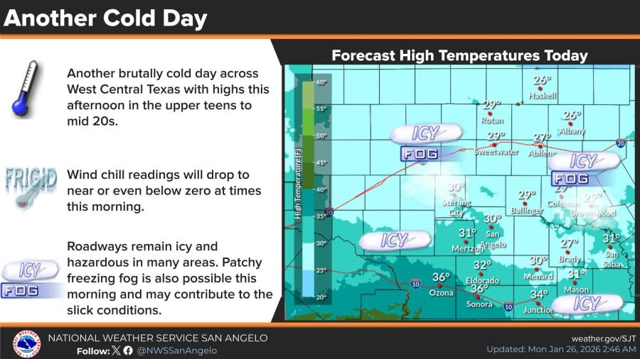 SAN ANGELO, TX — West Central Texas will endure another brutally cold day Monday with afternoon highs only in the upper teens to mid-20s and 30s, but a gradual warming trend is forecast to push temperatures into the 40s and 50s later this week, the National Weather Service said.
