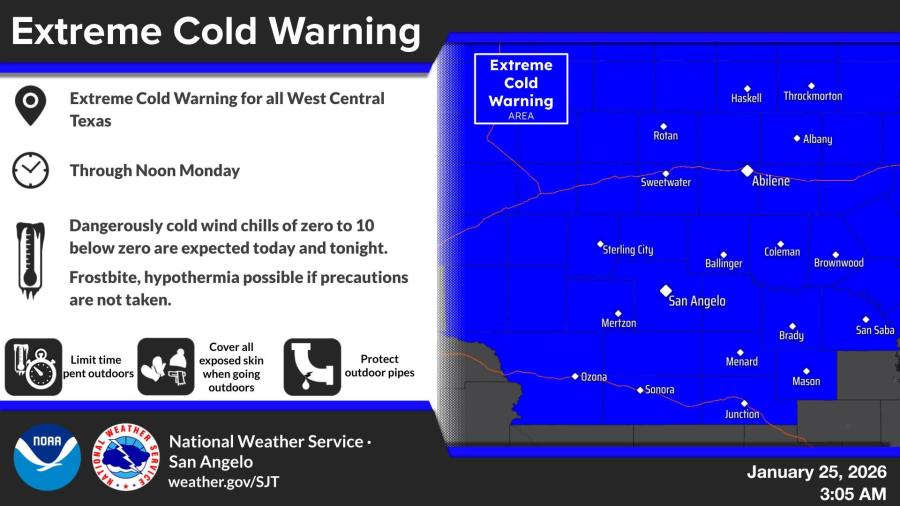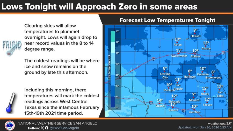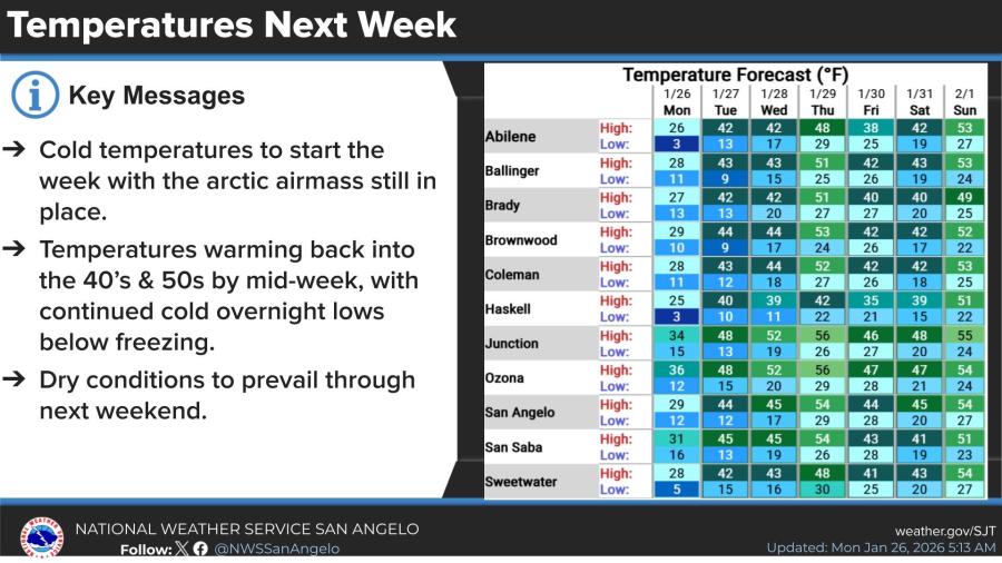 In San Angelo, Monday’s high is forecast near 29-31 degrees with a low around 12. Highs rise to 44-45 degrees Tuesday and Wednesday, then 54 degrees by Sunday, with lows gradually warming into the upper 20s. Similar patterns are expected in Abilene, Sweetwater, Brownwood, and Junction.