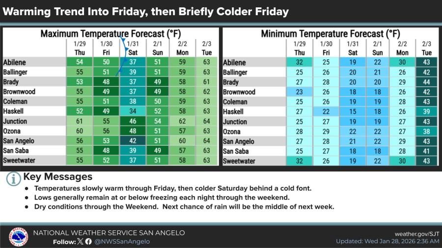 SAN ANGELO, TX — A brief warming trend will continue through Friday across West Texas before another cold front ushers in cooler conditions Saturday, the National Weather Service said Wednesday.