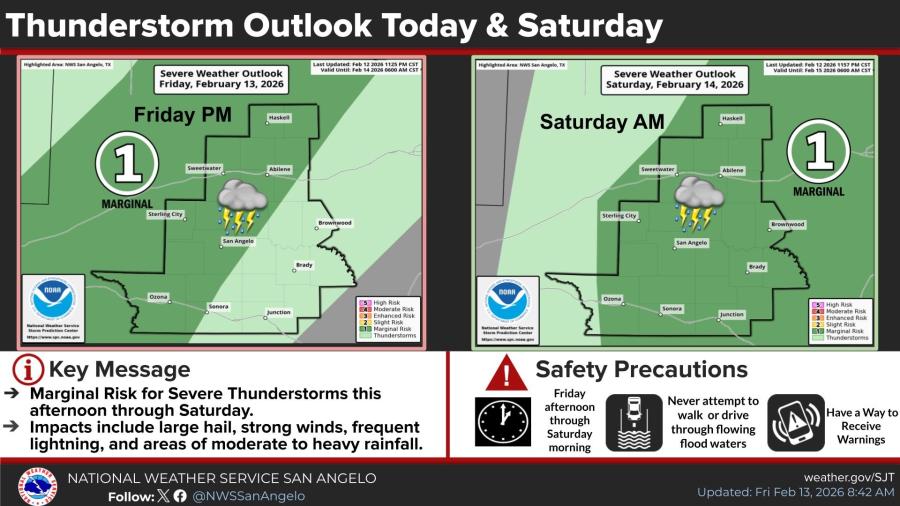 SAN ANGELO, TX — A marginal risk of severe thunderstorms is forecast across portions of West Central Texas from Friday afternoon through Saturday, with potential for large hail, strong winds, frequent lightning and moderate to heavy rainfall, the National Weather Service in San Angelo said.