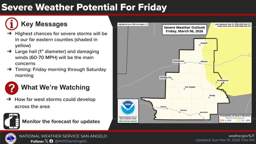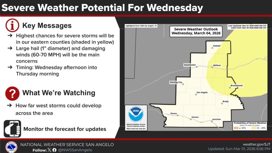 The primary threats are large hail up to 1 inch in diameter and damaging winds of 60-70 mph. The highest chances for severe storms are in eastern counties of the NWS San Angelo area, including regions around Abilene, Brownwood and Haskell, shaded in yellow on outlook maps.