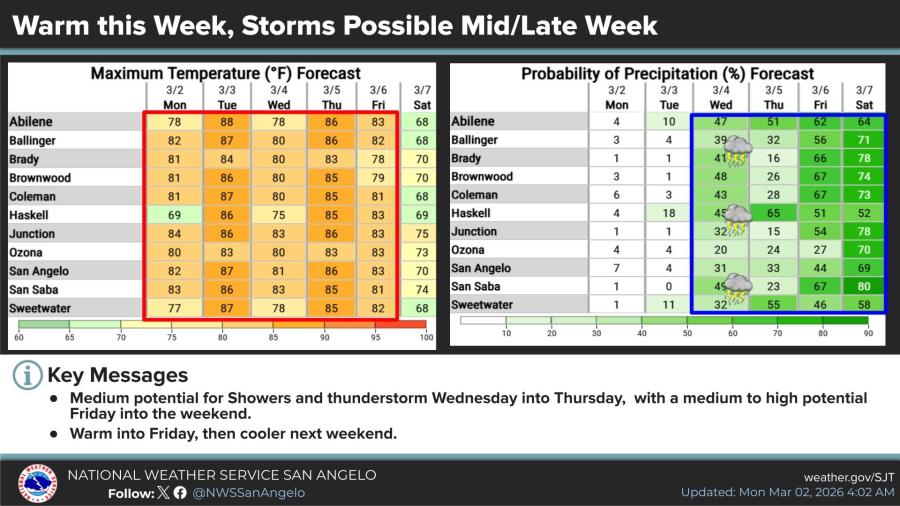 Temperatures will remain warm through Friday, with highs in the 80s across most locations — including 81-87 degrees in San Angelo, Abilene and surrounding areas Monday through Friday — before cooling this weekend.