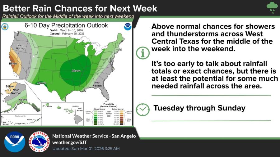 The 6-10 day outlook shows above-normal chances for showers and thunderstorms across West Central Texas from March 6-10, offering potential for much-needed rainfall, though totals remain uncertain.