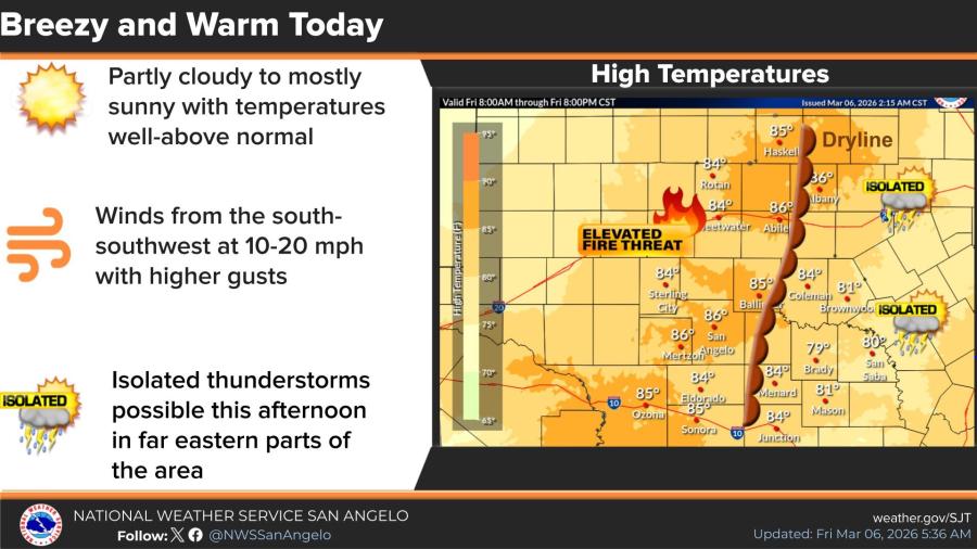 Friday's weather will be breezy and warm, with partly cloudy to mostly sunny skies and temperatures well above normal, reaching highs in the 80s. Winds from the south-southwest at 10-20 mph, with higher gusts, are forecast. Isolated thunderstorms are possible this afternoon in far eastern parts of the area, ahead of a dryline. Western portions, including the Big Country and Concho Valley, face elevated fire weather conditions due to warm, dry air combined with gusty winds.