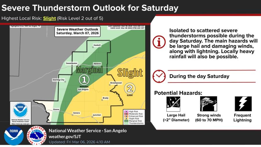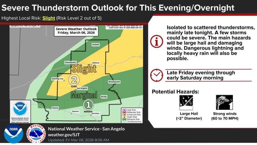 The highest local risk for severe weather is rated slight, or level 2 out of 5, for Friday evening through overnight, mainly late tonight. Storms may produce hail larger than 2 inches in diameter, winds of 60 to 70 mph and locally heavy rain. The affected area includes regions around San Angelo, with marginal risk extending to nearby towns like Ozona and Sonora.