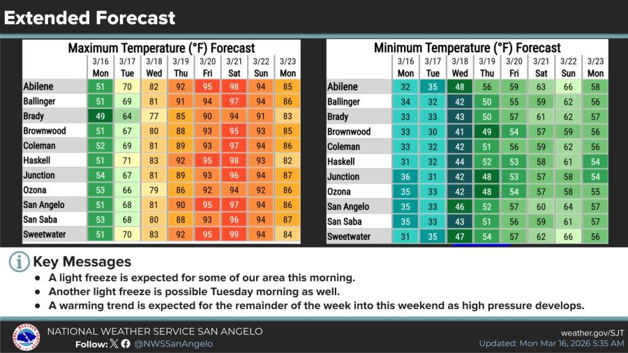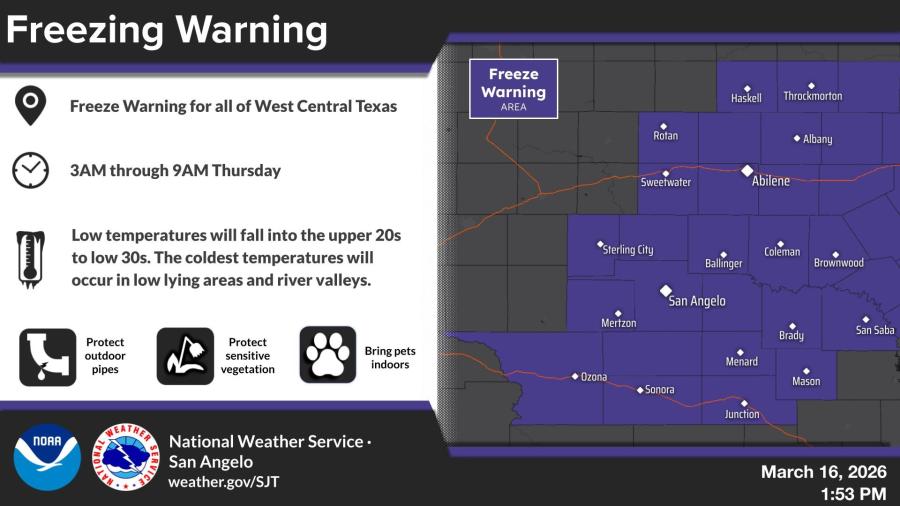 SAN ANGELO, TX — The National Weather Service has issued a freeze warning for all of West Central Texas, with overnight lows expected to drop into the upper 20s and lower 30s tonight into Tuesday morning.