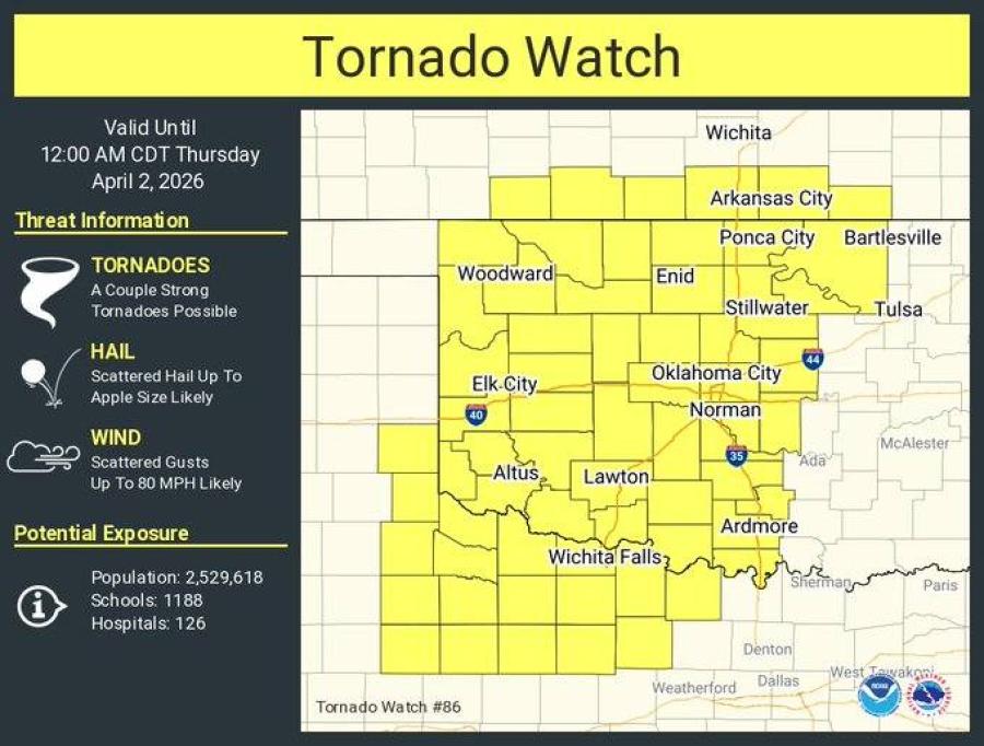 Tornado Watch #86 is in effect until 12 a.m. CDT Thursday, April 2, the National Weather Service said. The watch covers an area with a population of 2,529,618, along with 1,188 schools and 126 hospitals, according to the NWS graphic.