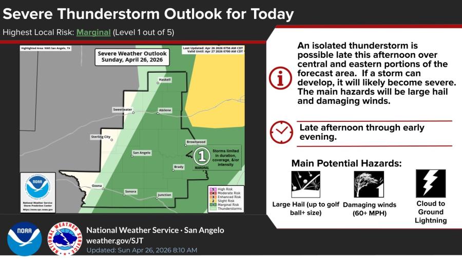 SAN ANGELO, TX — An isolated thunderstorm is possible late Sunday afternoon and early evening across central and eastern portions of the National Weather Service San Angelo forecast area, forecasters reported.
