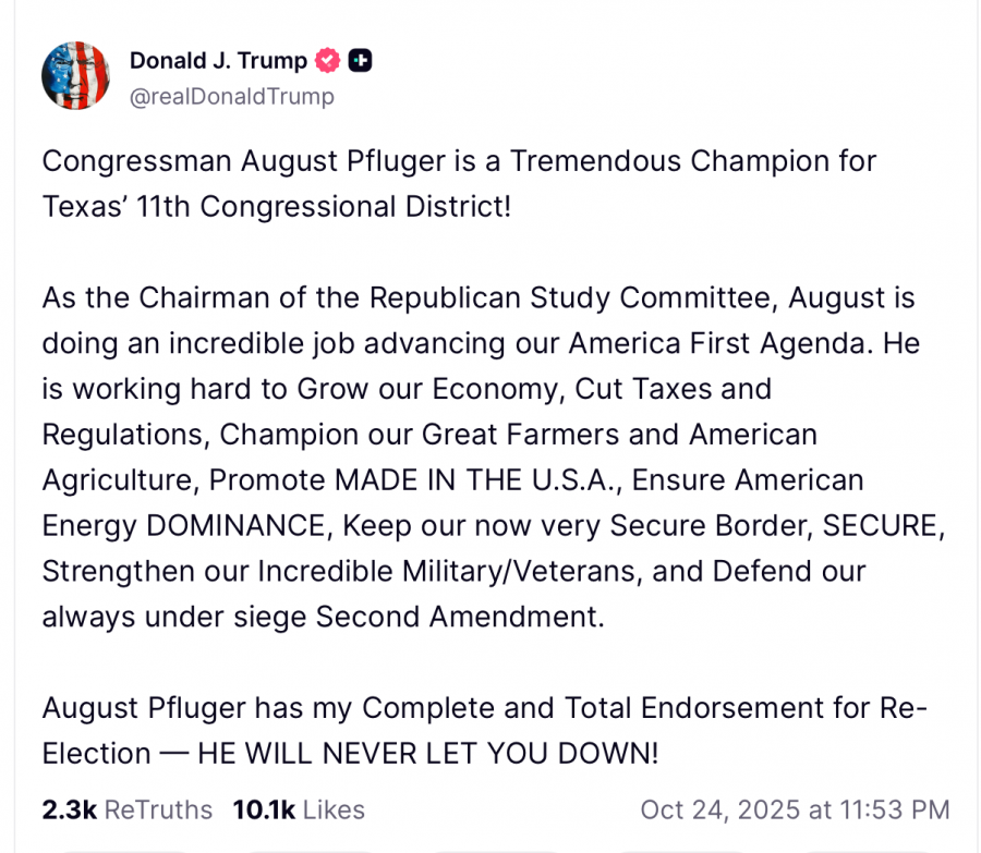 WASHINGTON, DC — President Donald J. Trump posted the following on Truth Social in strong support of Congressman August Pfluger (TX-11). See the post here or read it below.