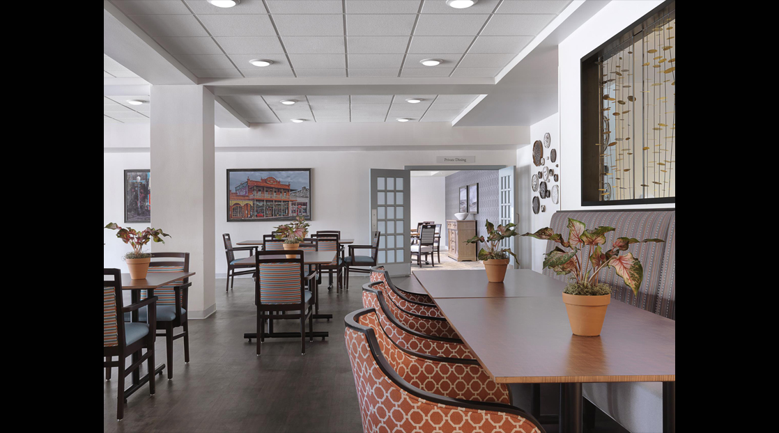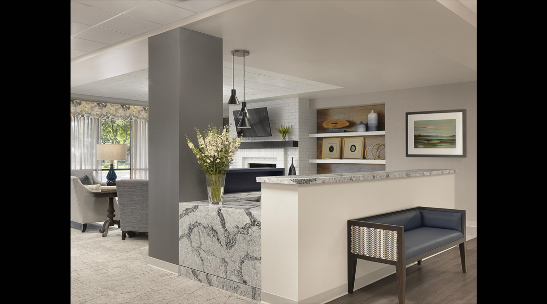 The renovation transformed the building’s main lobby and dining spaces to improve efficiencies, enhance wayfinding and create elevated environments where residents can socialize and connect.