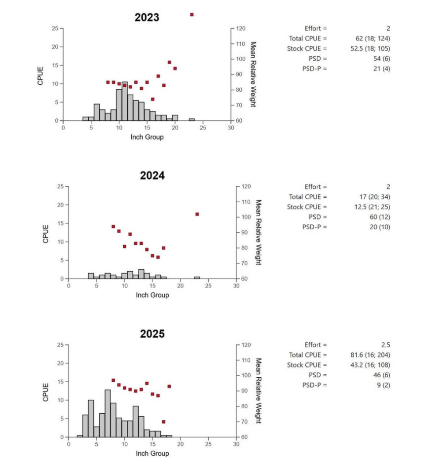 Charts released by the district show year-to-year comparisons for 2023, 2024, and 2025, including catch-per-unit-effort (CPUE), relative weight data, and proportional size distribution indices.