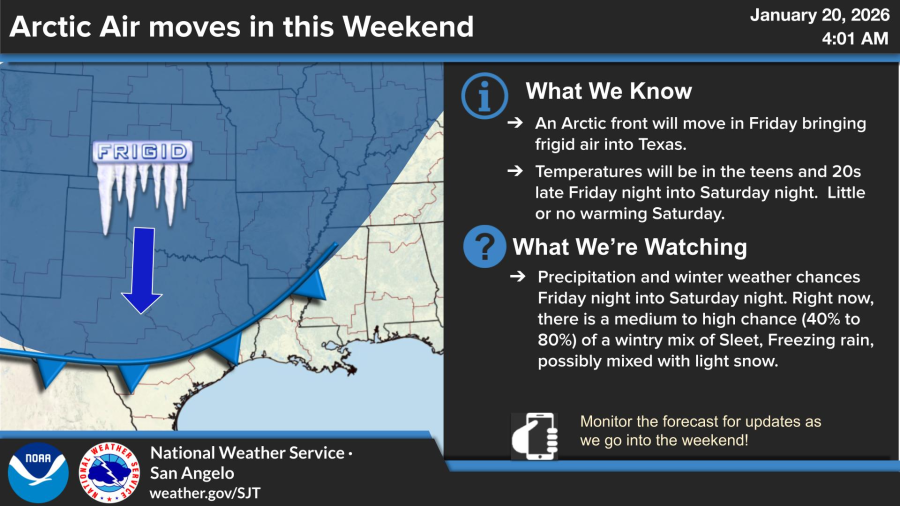 The National Weather Service in San Angelo warned of an incoming arctic front bringing temperatures into the teens and 20s late Friday night into Saturday night, with a 40% to 80% chance of a wintry mix of sleet, freezing rain and possible snow.