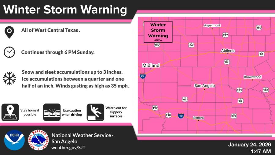 A Winter Storm Warning remains in effect for all of West Central Texas through 6 p.m. Sunday. Significant accumulations of freezing rain, sleet and snow are expected, with the event beginning Friday night and continuing through the weekend.