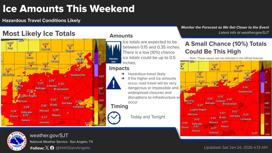A brief lull in precipitation occurred Saturday morning after patchy light amounts overnight, but coverage will increase again this afternoon, according to NWS timing graphics. Northern areas of the Big Country are likely to see mainly sleet and snow tonight, while areas farther south will experience a mix of freezing rain and sleet.