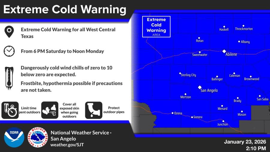 The National Weather Service in San Angelo urged residents to limit time outdoors, cover exposed skin, protect outdoor pipes and use caution if travel is necessary. Winds gusting as high as 35 mph are also possible through Sunday.