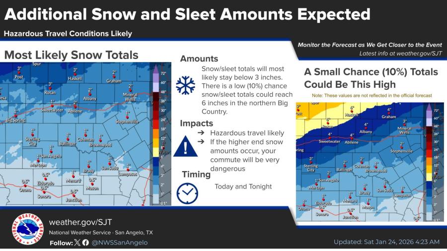 Snow and sleet totals will most likely stay below 3 inches, though there is a low (10%) chance of up to 6 inches in northern portions of the Big Country.