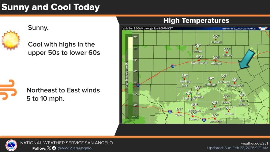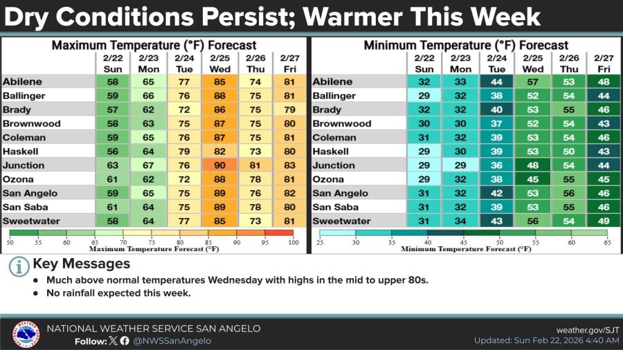 Humidity is expected to drop to 10% to 15%, with west winds at 15 to 20 mph and gusts up to 25 mph. High temperatures will reach 85 to 90 degrees across the region, including near 89 degrees in San Angelo, 90 in Junction, and mid-to-upper 80s in areas like Abilene, Brownwood and Brady.