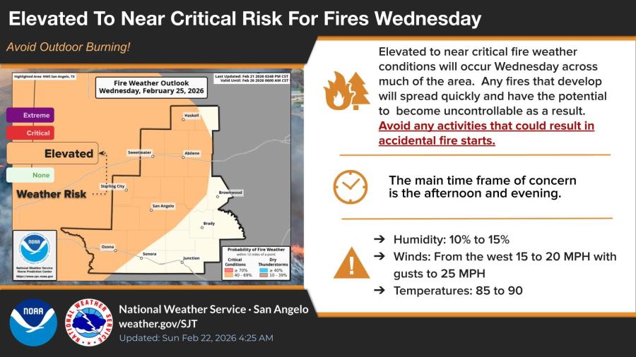 SAN ANGELO, TX — The National Weather Service in San Angelo is warning of elevated to near-critical fire weather conditions across much of West Central Texas on Wednesday, Feb. 25, 2026, as dry air, breezy winds and warm temperatures combine with abundant dry fuels.