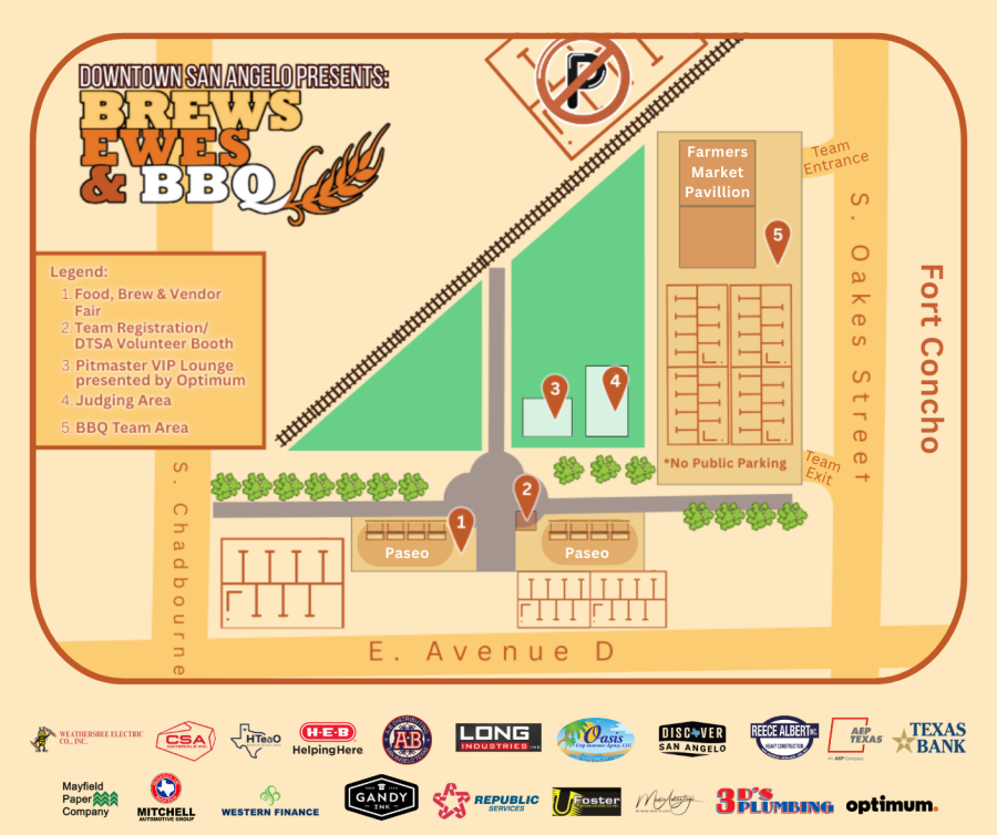 SAN ANGELO, TX – Due to forecasted rainfall and to help preserve park conditions, the Brews, Ewes & BBQ Cook-off will be relocating from Bart DeWitt Park to the San Angelo Farmers Market Pavilion and Paseo area at 609 S Oakes St.