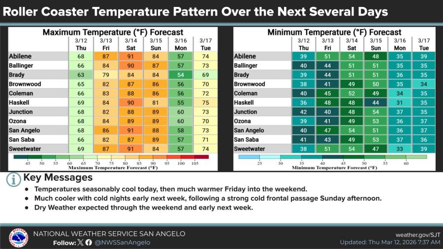 SAN ANGELO, TX — A sharp swing in temperatures is forecast for West Texas over the next several days, starting with seasonally cool conditions Thursday before warming significantly into the weekend and then cooling again early next week, according to the National Weather Service in San Angelo.