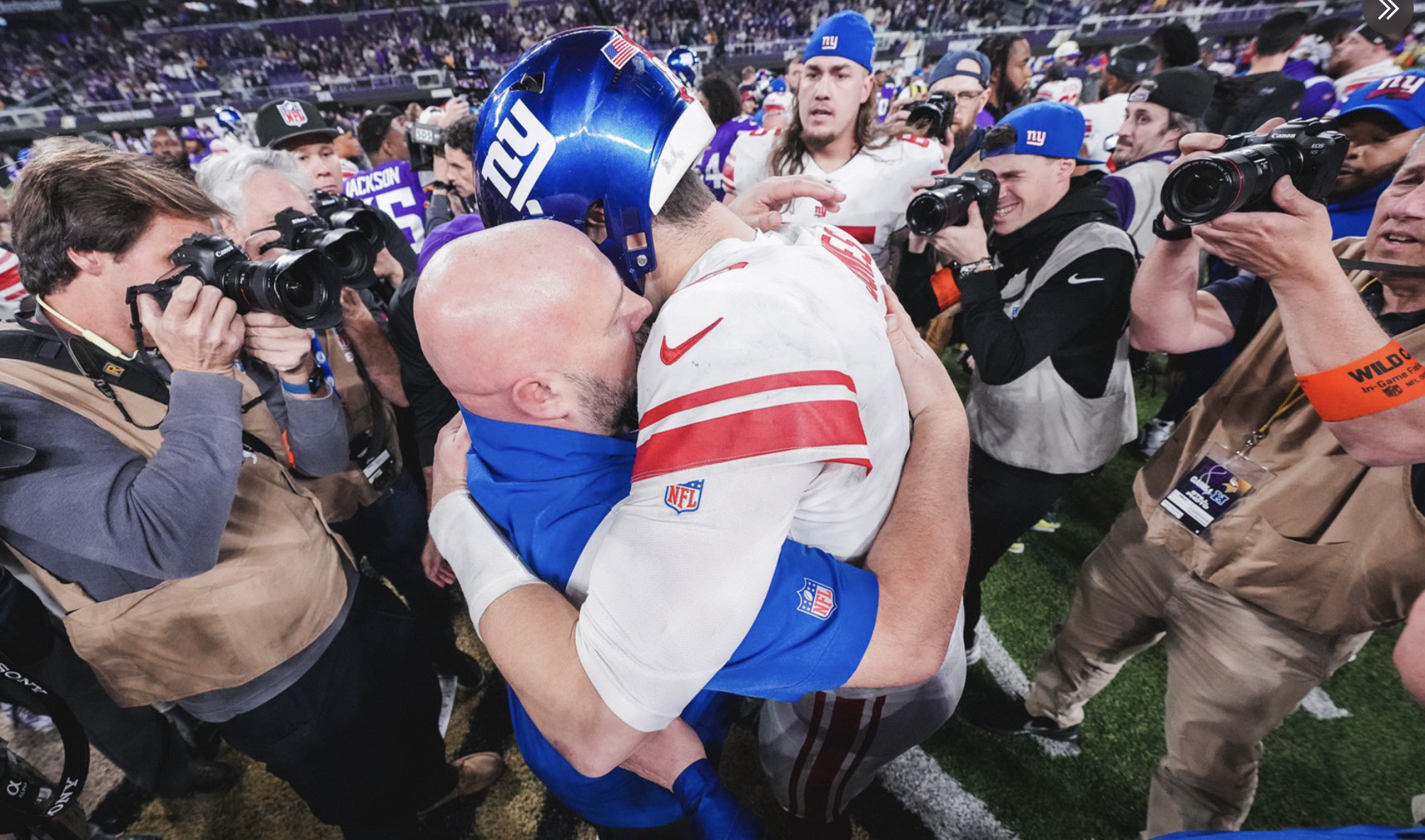 New York Giants Quarterback Daniel Jones embraces Head Coach Brian Dabol after win versus the Vikings