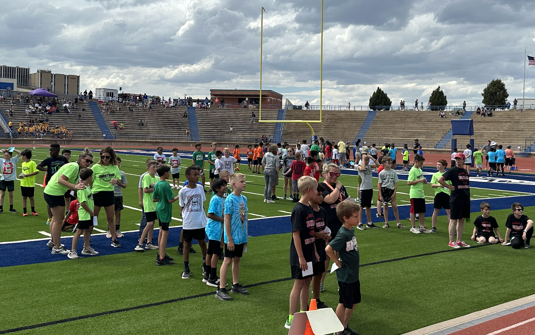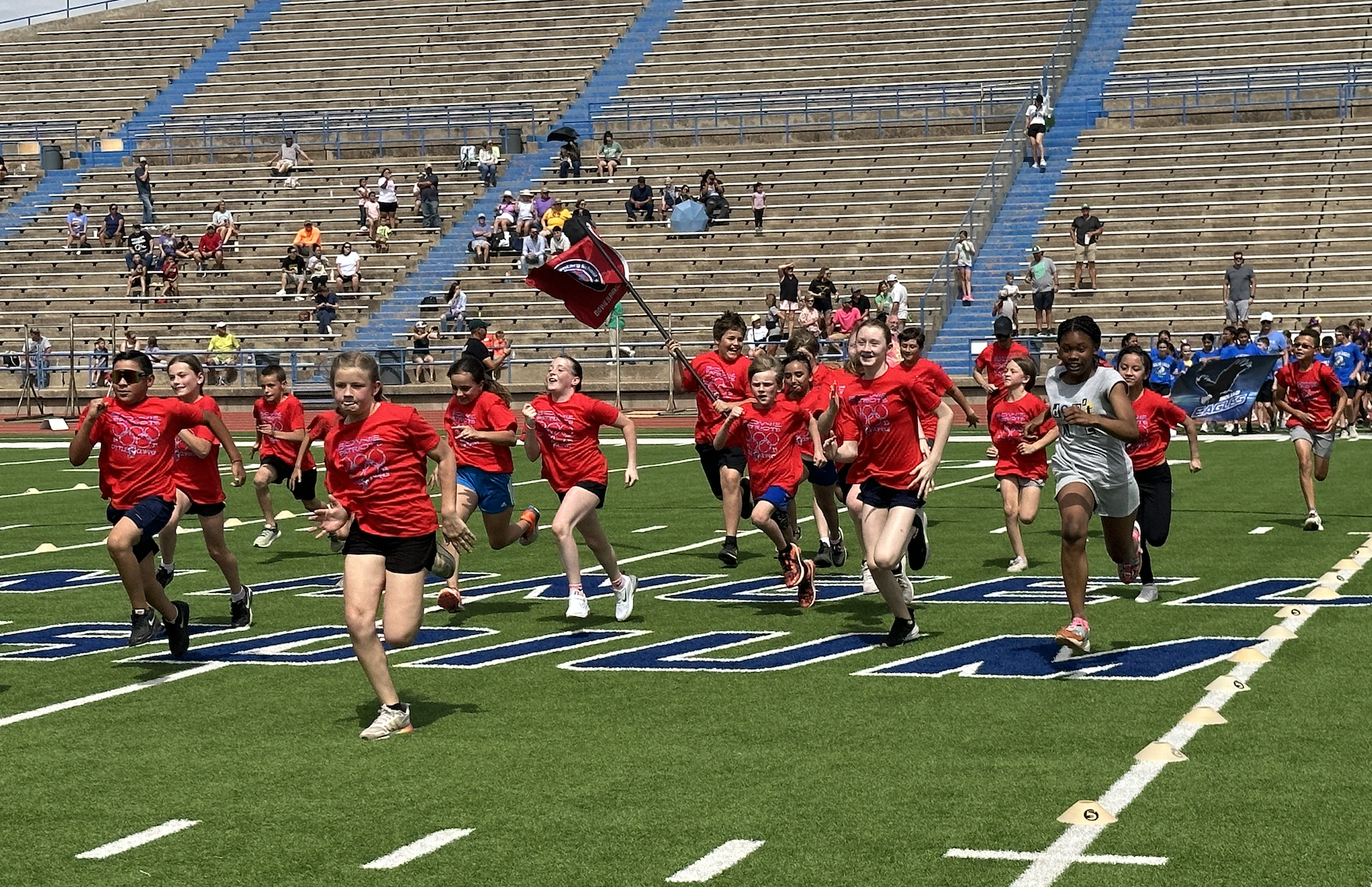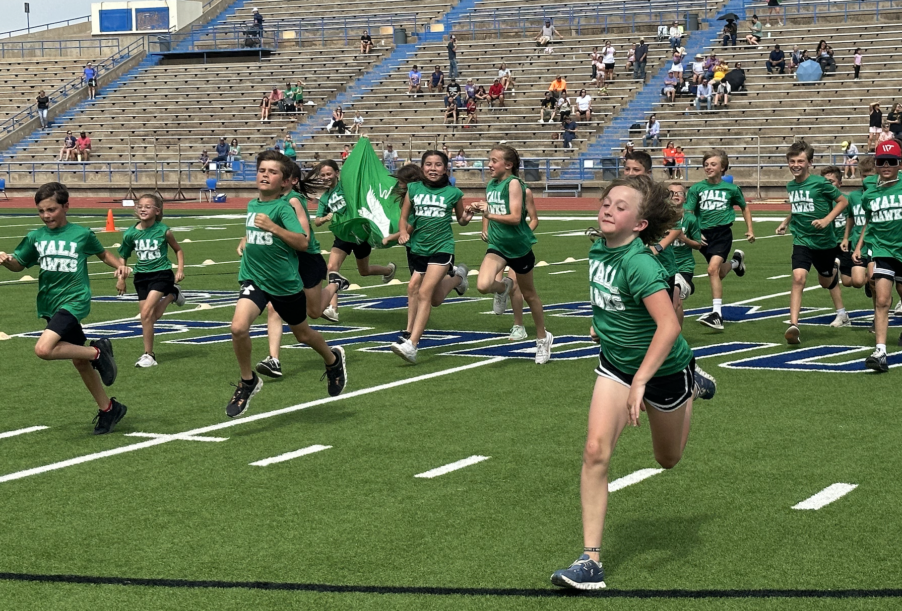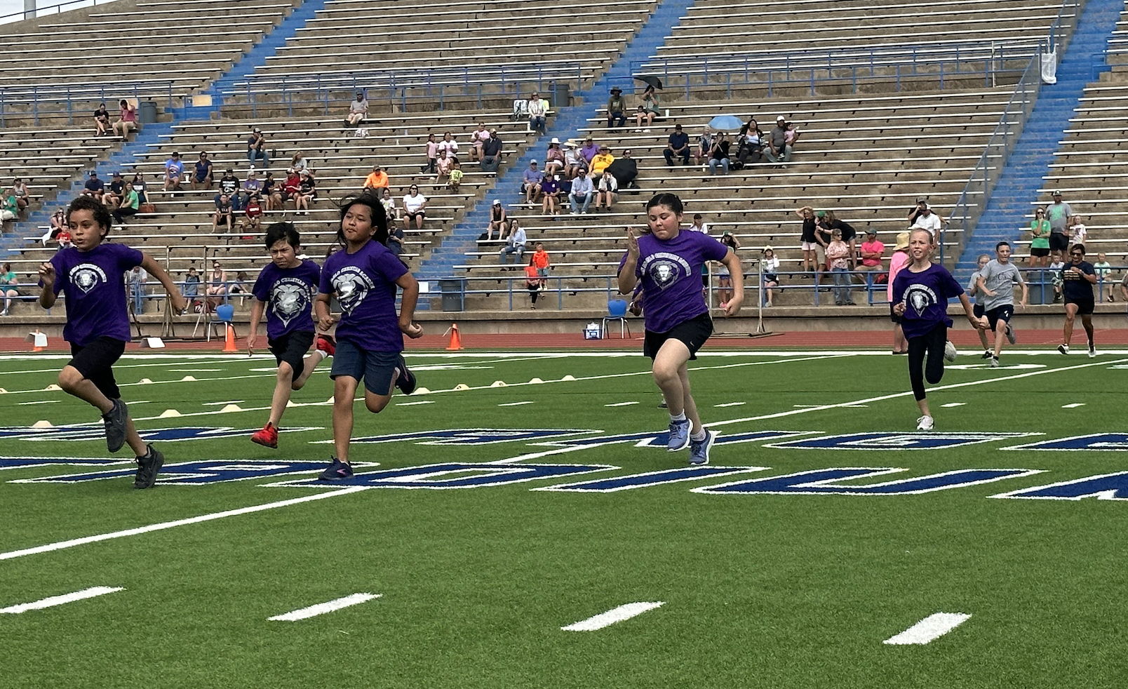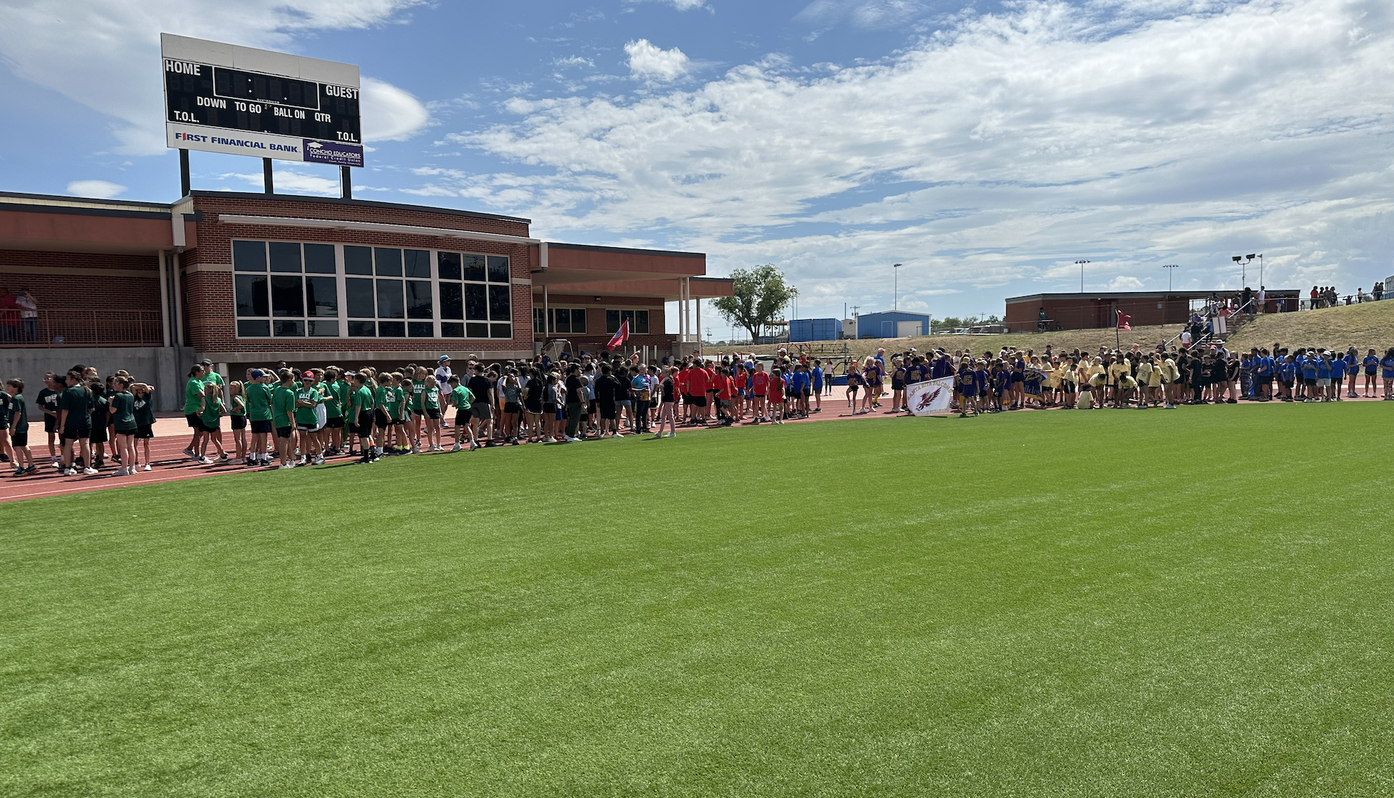 Before the lightning ultimately ruined the fun, the students and their teachers gathered on the track to represent their schools. They carried their school’s flags around the track before they ran together across the football field during the opening ceremonies. After that, field events began. There were more than just San Angelo schools present. Wall, Christoval, Miles, Veribest, and Grape Creek also sent their elementary schools to San Angelo Stadium.
