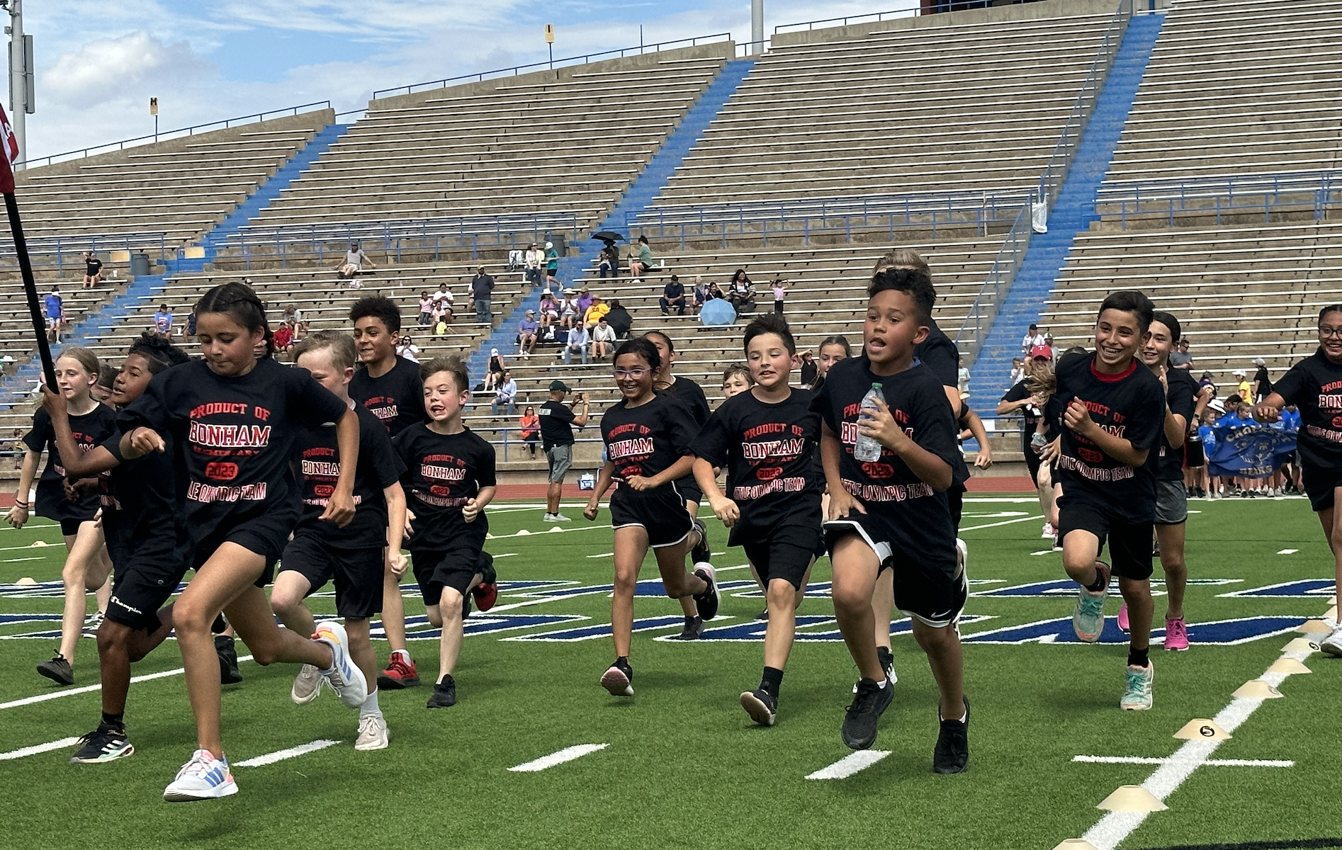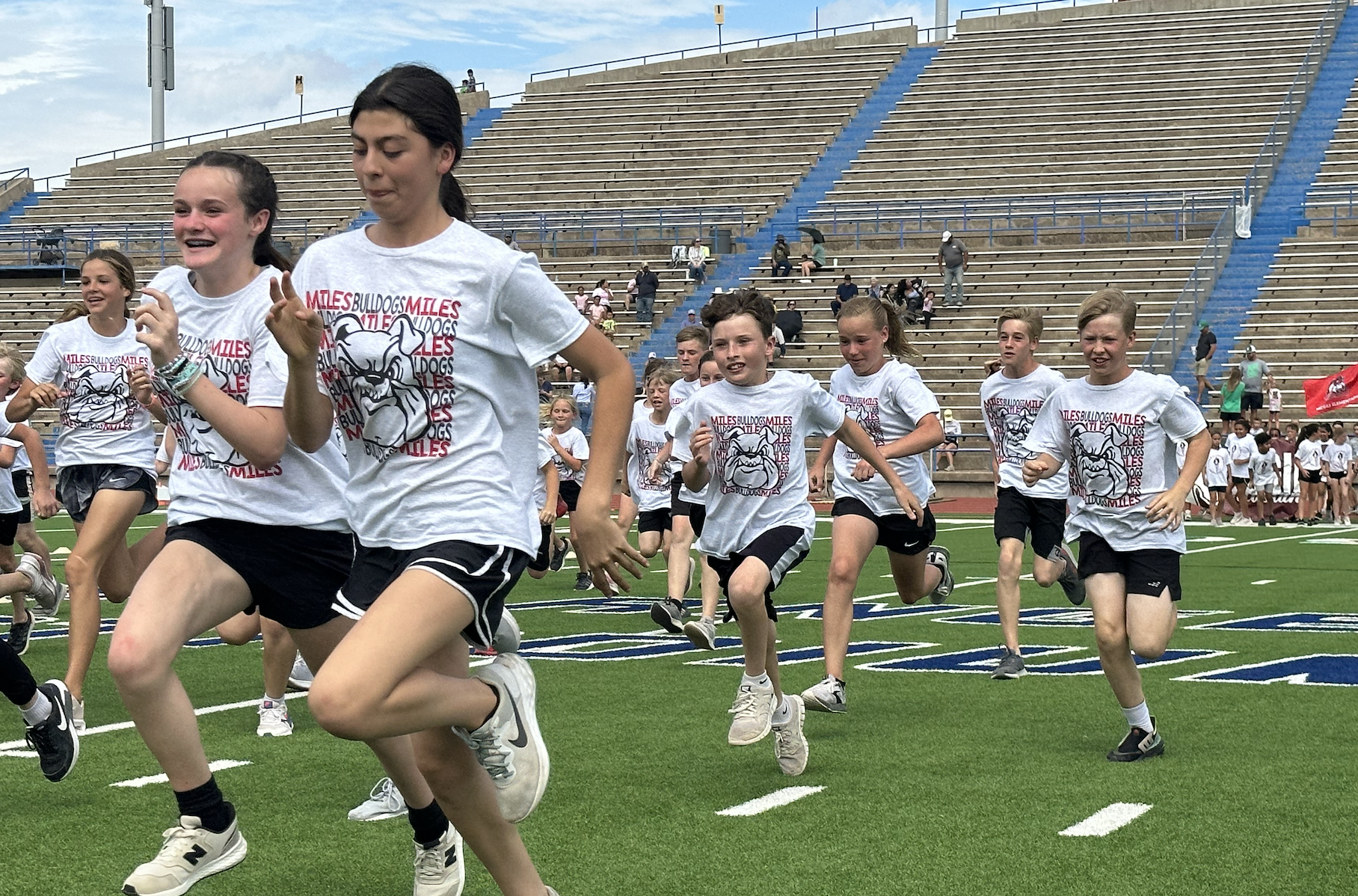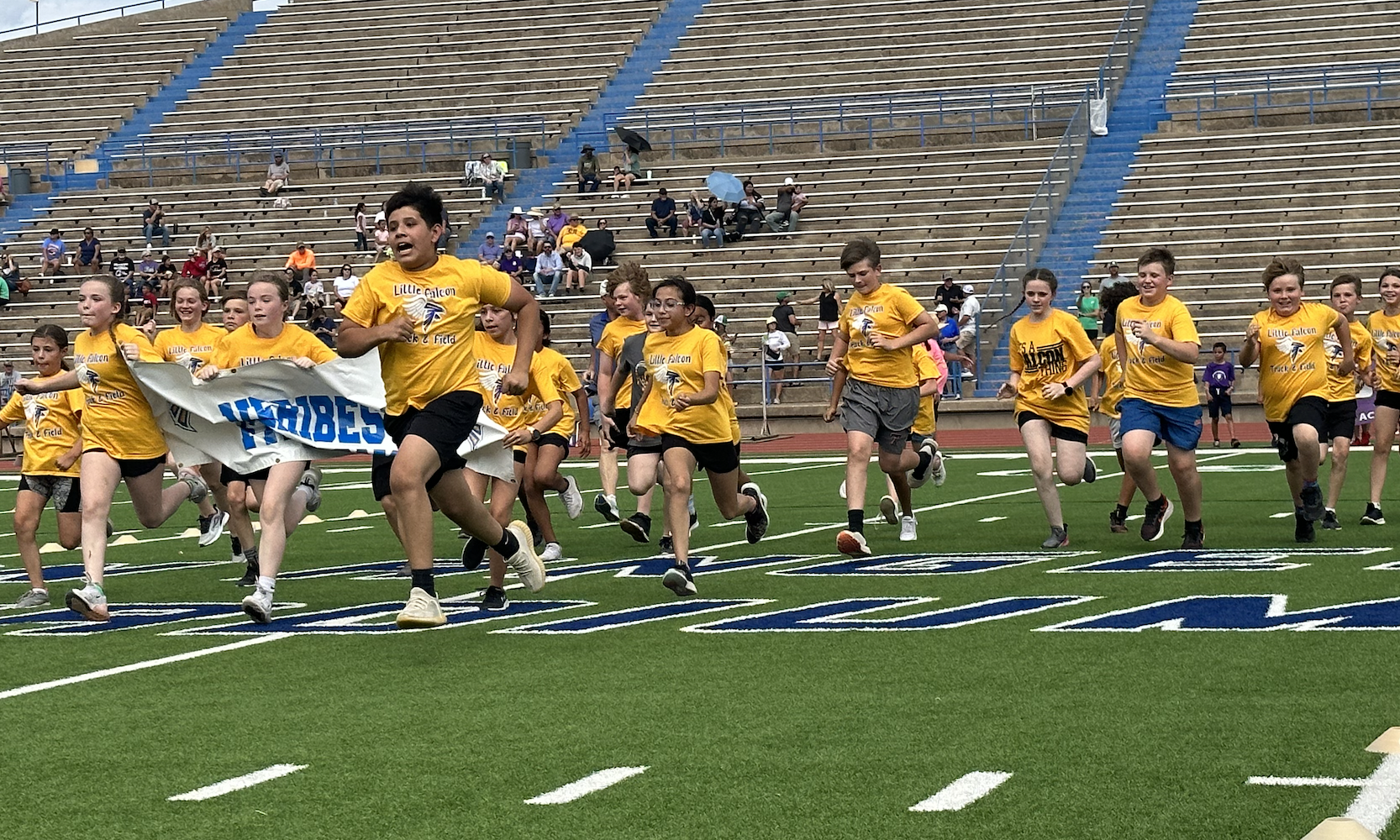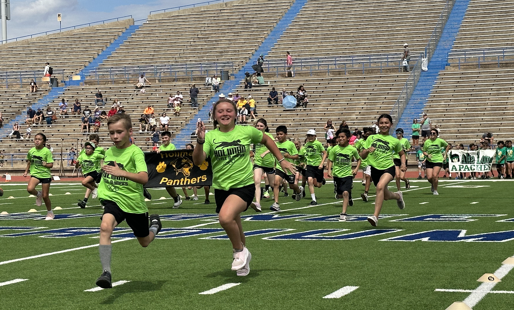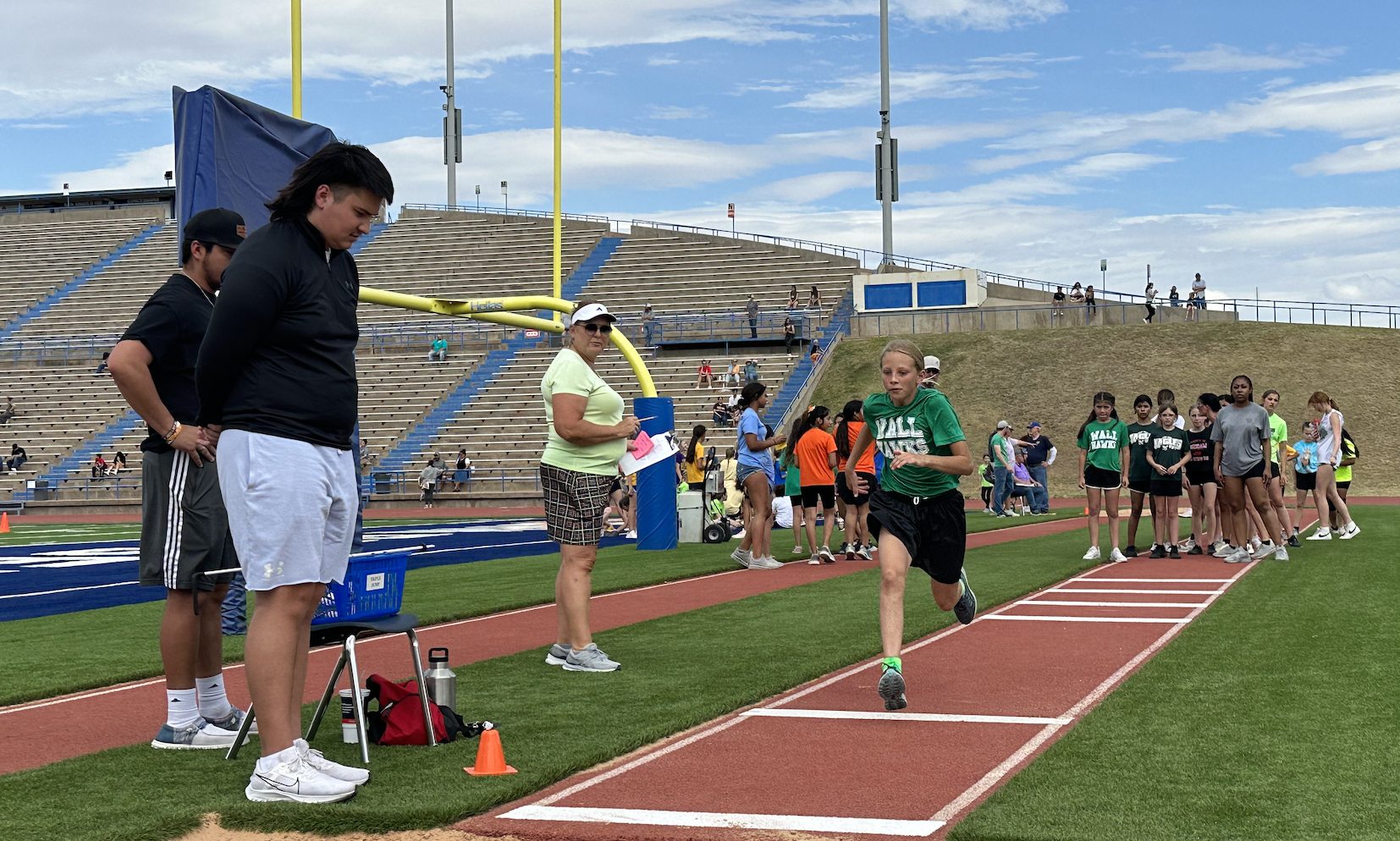 Before the lightning ultimately ruined the fun, the students and their teachers gathered on the track to represent their schools. They carried their school’s flags around the track before they ran together across the football field during the opening ceremonies. After that, field events began. There were more than just San Angelo schools present. Wall, Christoval, Miles, Veribest, and Grape Creek also sent their elementary schools to San Angelo Stadium.