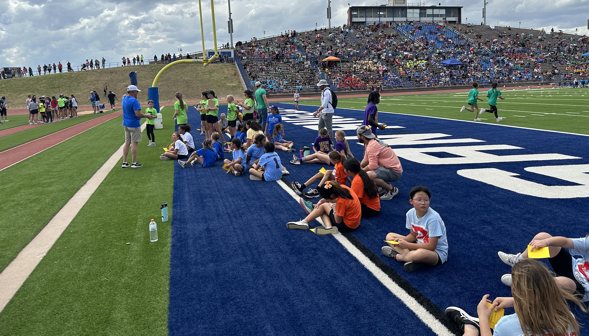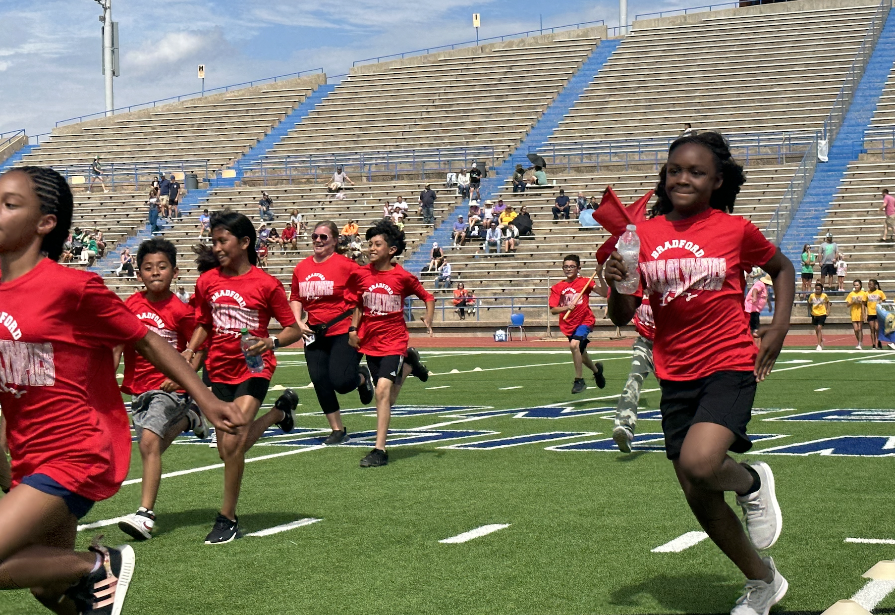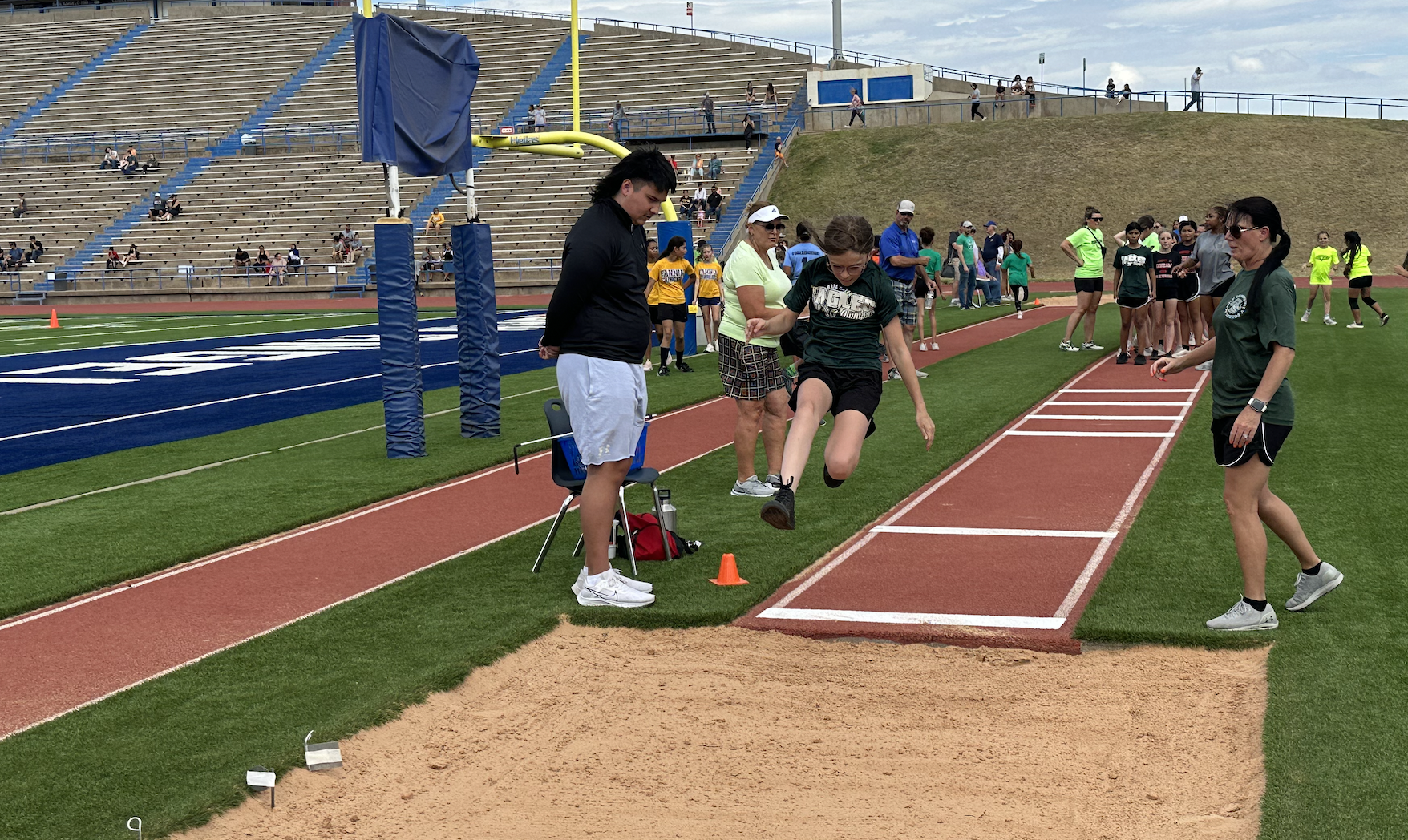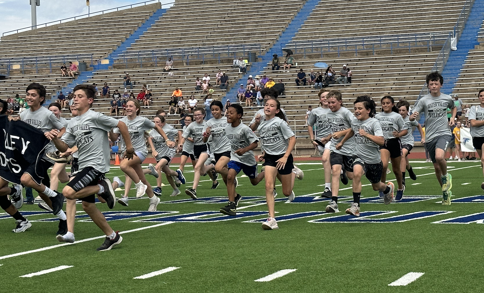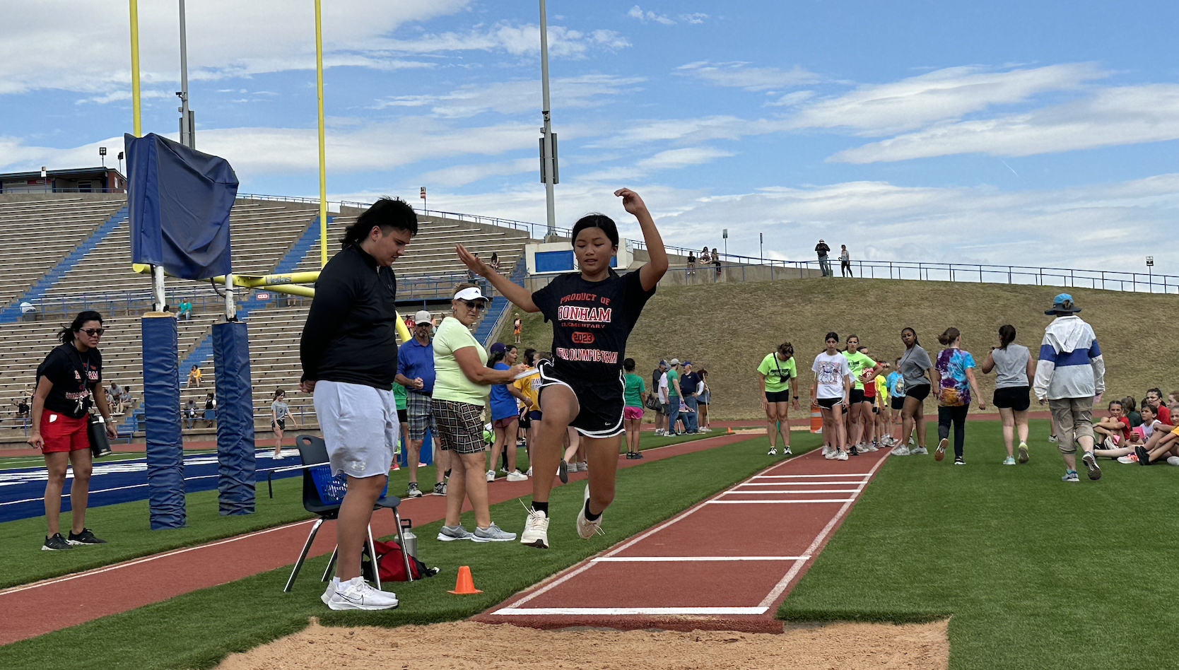 Before the lightning ultimately ruined the fun, the students and their teachers gathered on the track to represent their schools. They carried their school’s flags around the track before they ran together across the football field during the opening ceremonies. After that, field events began. There were more than just San Angelo schools present. Wall, Christoval, Miles, Veribest, and Grape Creek also sent their elementary schools to San Angelo Stadium.