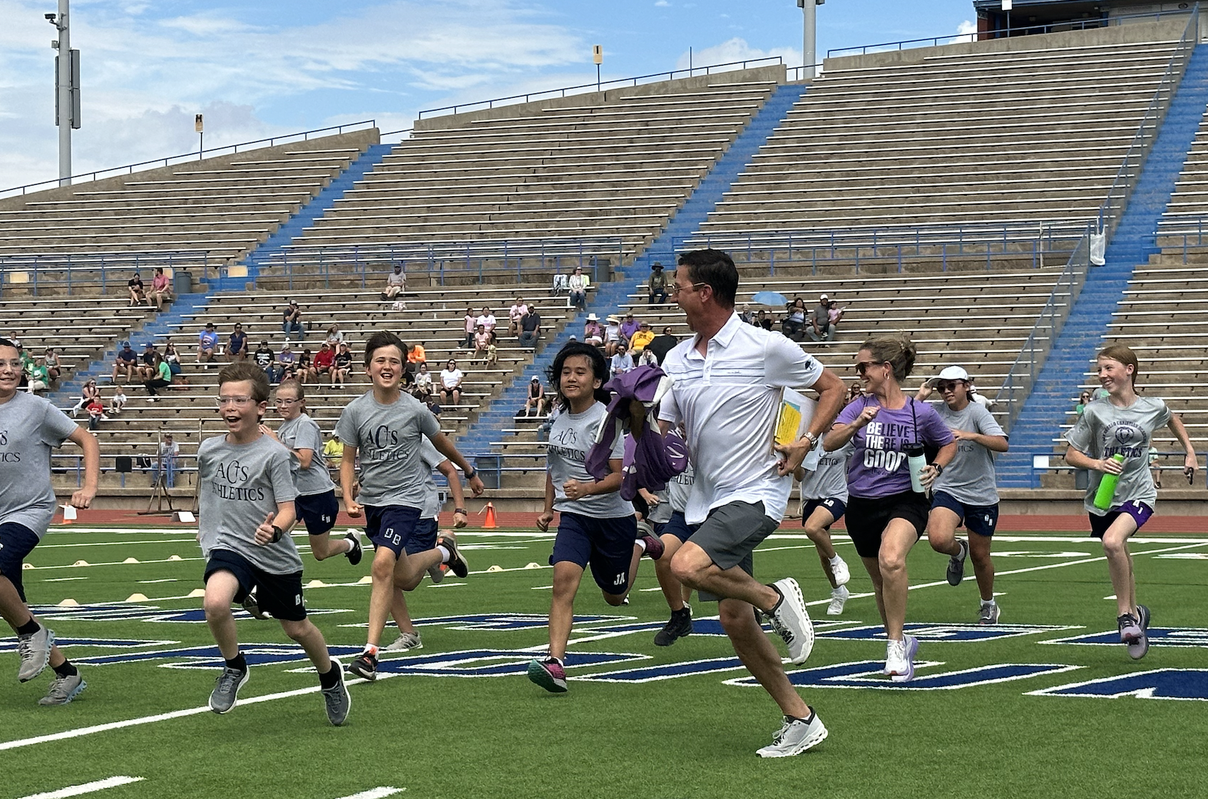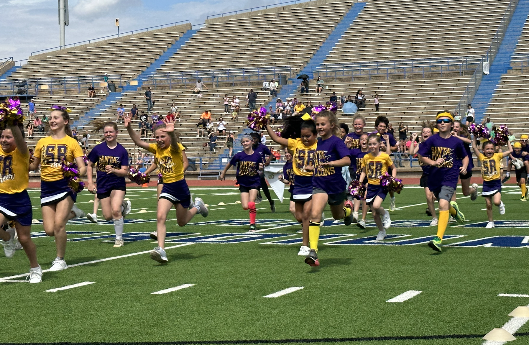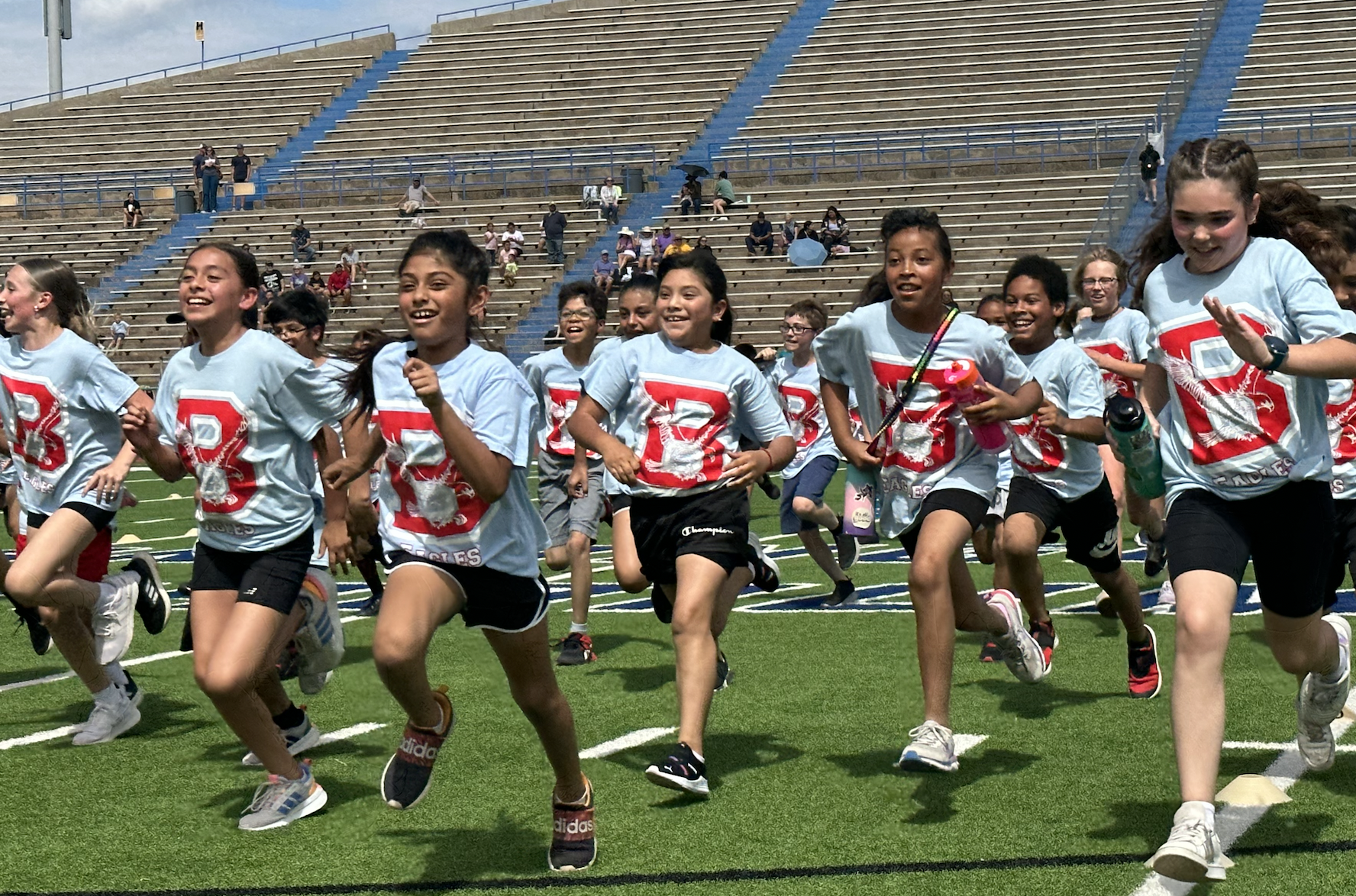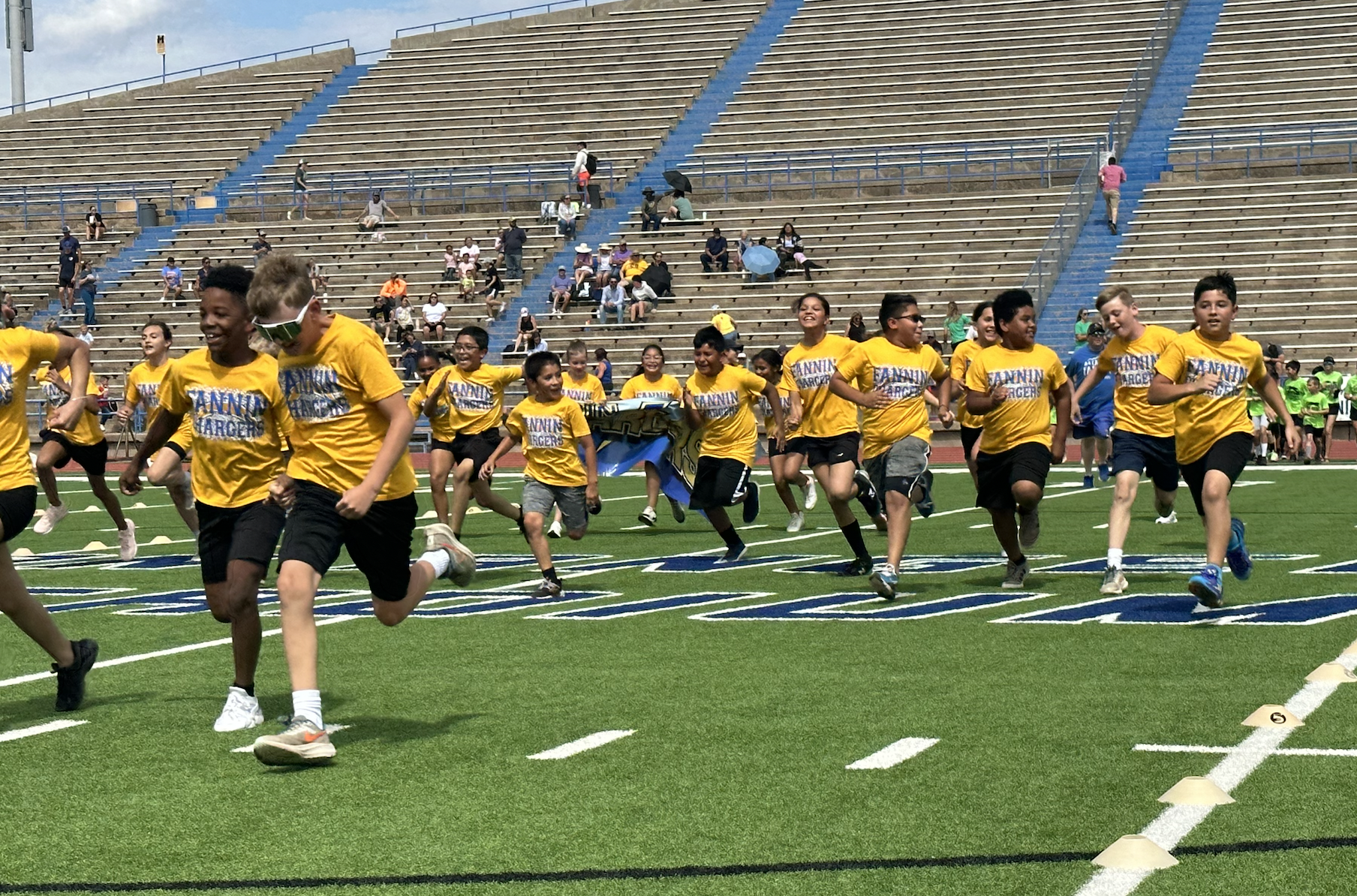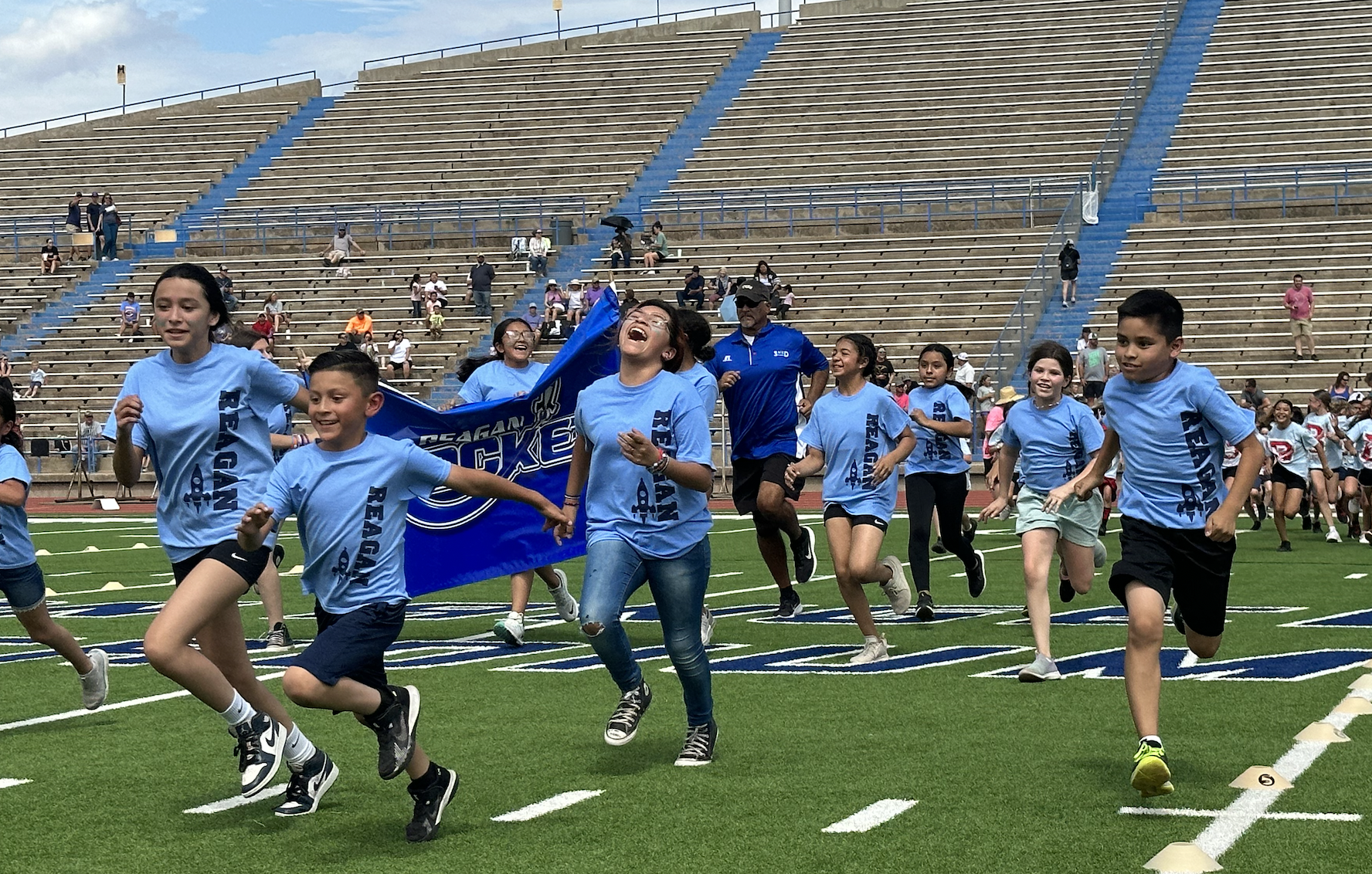 Before the lightning ultimately ruined the fun, the students and their teachers gathered on the track to represent their schools. They carried their school’s flags around the track before they ran together across the football field during the opening ceremonies. After that, field events began. There were more than just San Angelo schools present. Wall, Christoval, Miles, Veribest, and Grape Creek also sent their elementary schools to San Angelo Stadium.