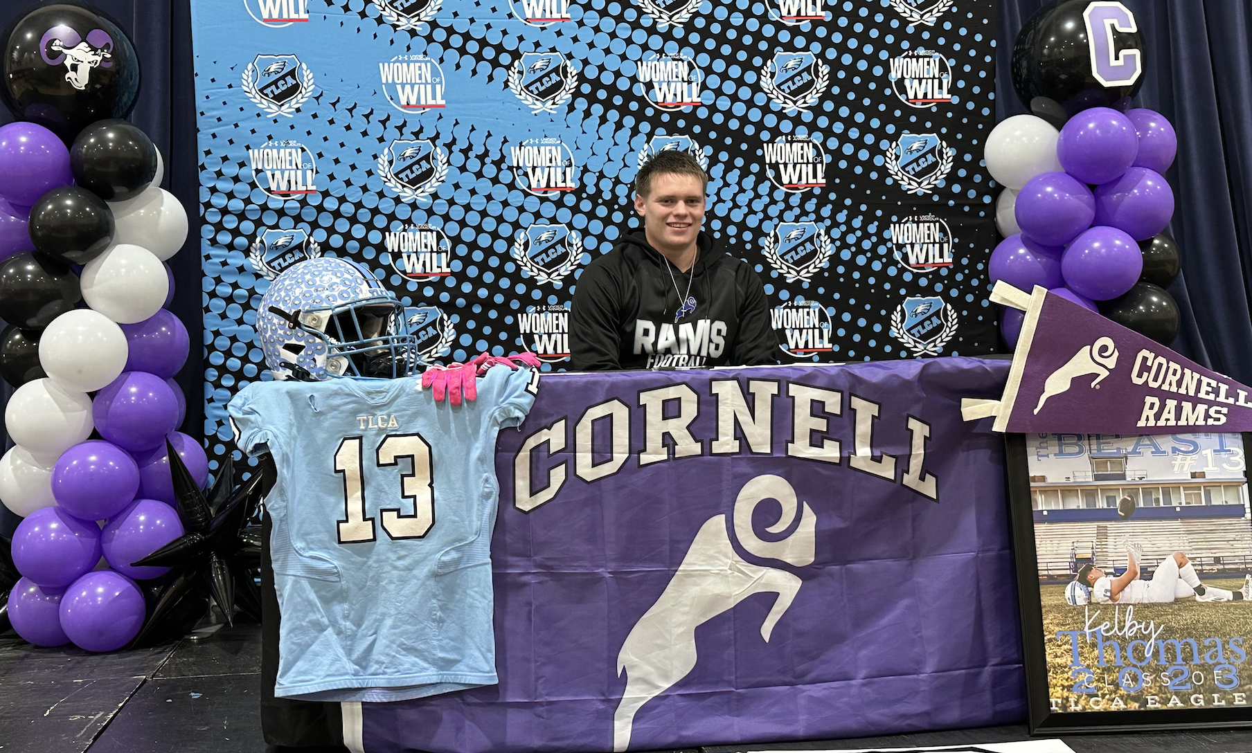 The Eagles Kelby Thomas signed to play football at Cornell College today at the San Angelo TLCA high school gymnasium. Thomas played several sports at TLCA including football and basketball.