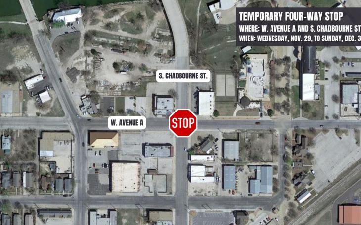 Due to the Concho Christmas Celebration light tour being diverted down Avenue A, there will be a new four-way stop at the intersection of Chadbourne and Avenue A.