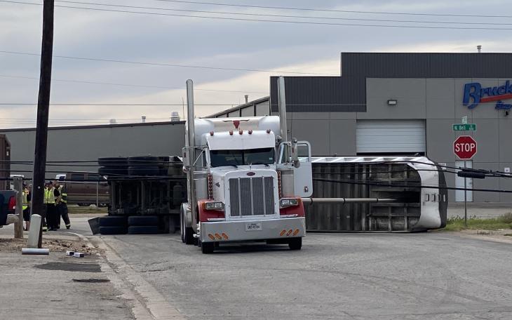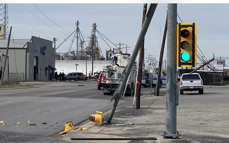 A 41-year-old suspect was taken into custody Tuesday afternoon after allegedly stealing a bobtail truck, accidentally raising the dump bed, and crashing into power lines and a signal light on Bell St.