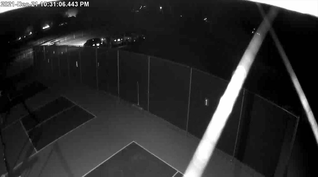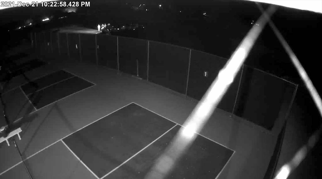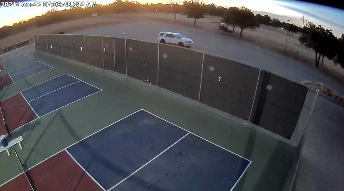 Surveillance images show multiple vehicles near the tennis courts. A group of people is also visible in some of the pictures.