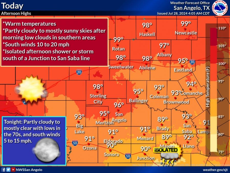 SAN ANGELO, TX – The National Weather Service in San Angelo released a weather update indicating warm temperatures today with highs approaching the upper 90s across the region.