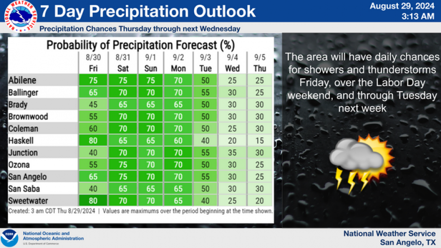 SAN ANGELO, TX — The National Weather Service has forecasted isolated thunderstorms for the San Angelo area today, with a 20 percent chance of rain after 1 p.m.