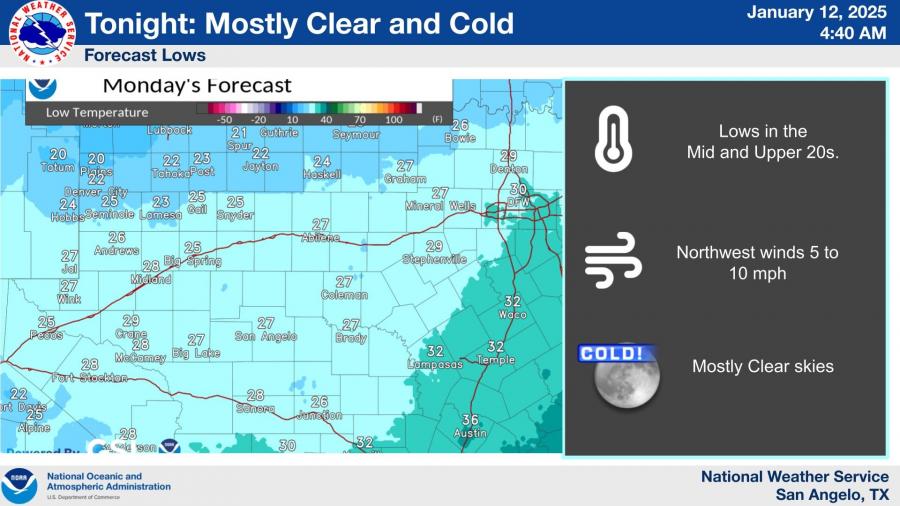 Highs will range from the low to mid-50s in San Angelo and surrounding areas to the mid-50s in southern locations, accompanied by north winds of 10 to 15 mph.