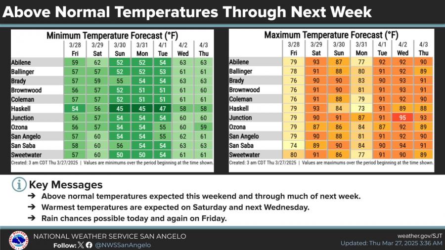 San Angelo is not included in the marginal risk zone for severe storms, and any precipitation that does fall is likely to be short-lived.