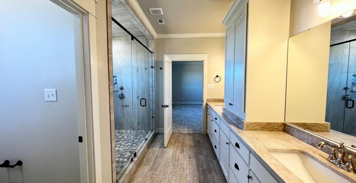 The first floor has a great open floor plan, there is a 2 story tall entryway, a gorgeous staircase, all of the bedrooms are upstairs and so is laundry room. The primary bedroom is large, with an amazing bathroom with a full wet room, double sinks, a private water closet, so much storage and a large closet.