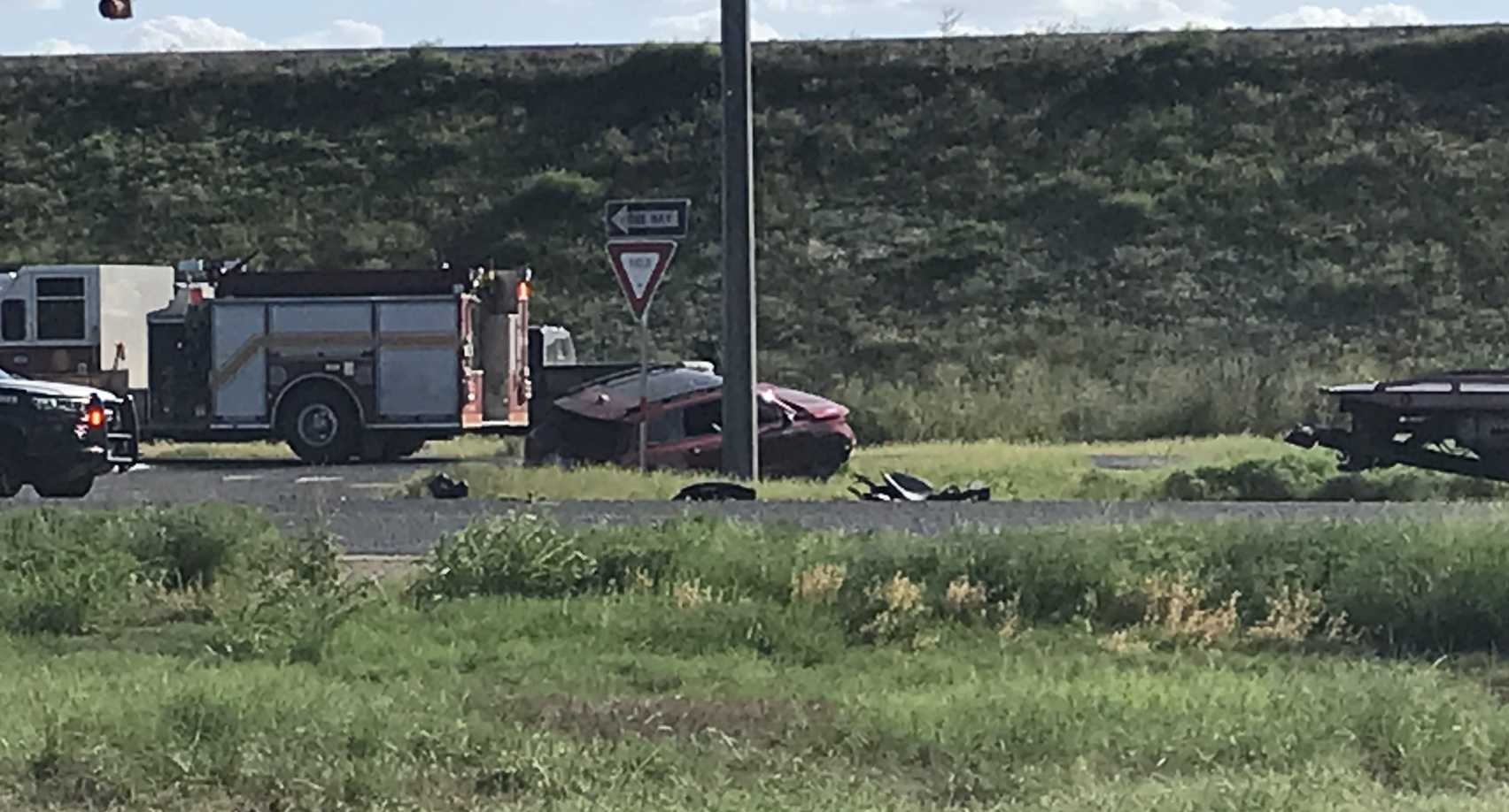 Reporters on the scene observed a red vehicle and a white truck involved in the crash. Radio reports indicated that one of the vehicles rolled multiple times and that one person was transported to the hospital.