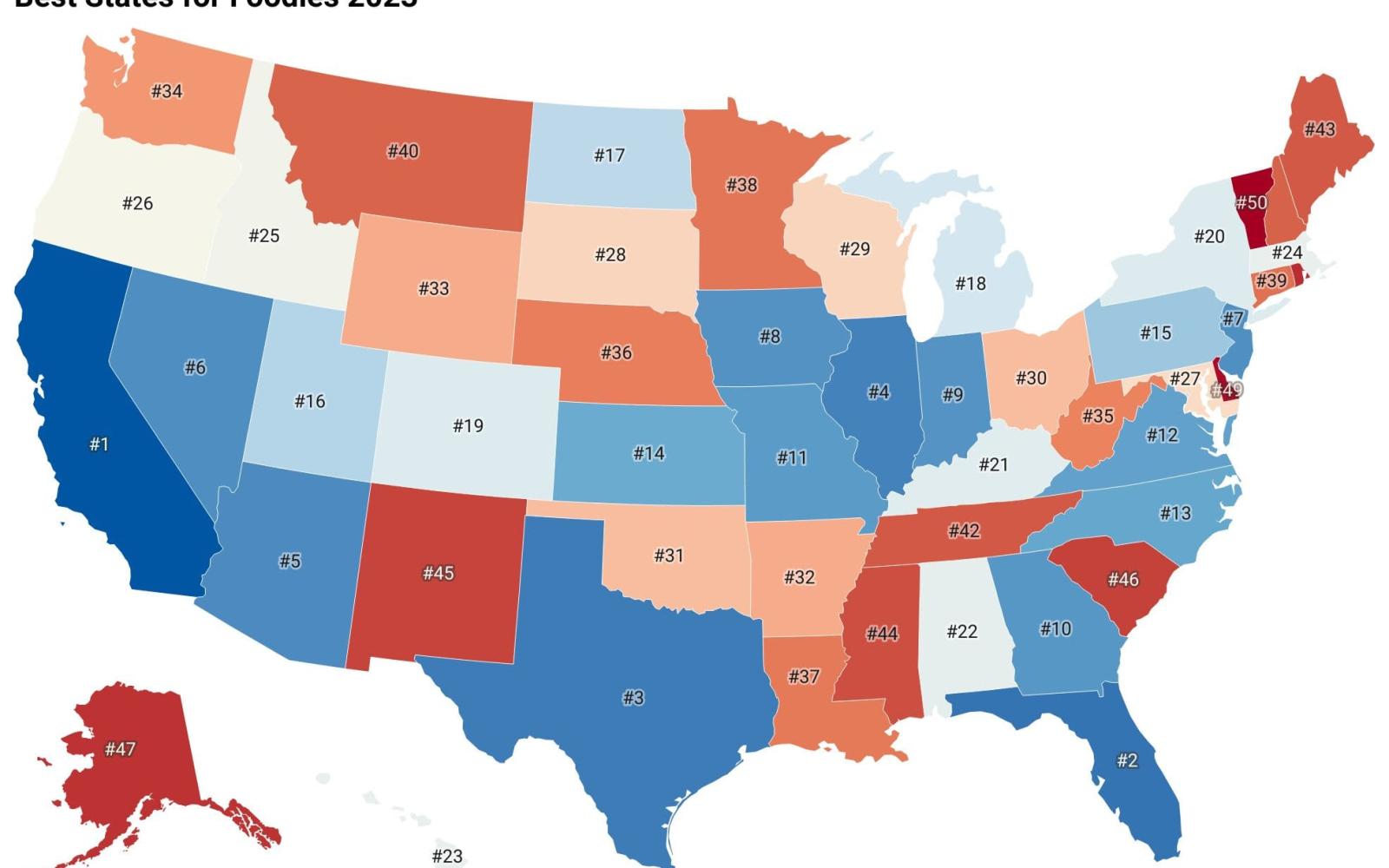 The state's diverse culinary scene, spanning farm-to-table eateries and vibrant ethnic cuisines, solidifies its top-ranking position.