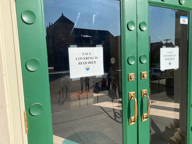 There are signs posted on the doors of City Hall reading 'Face Coverings Required.'
