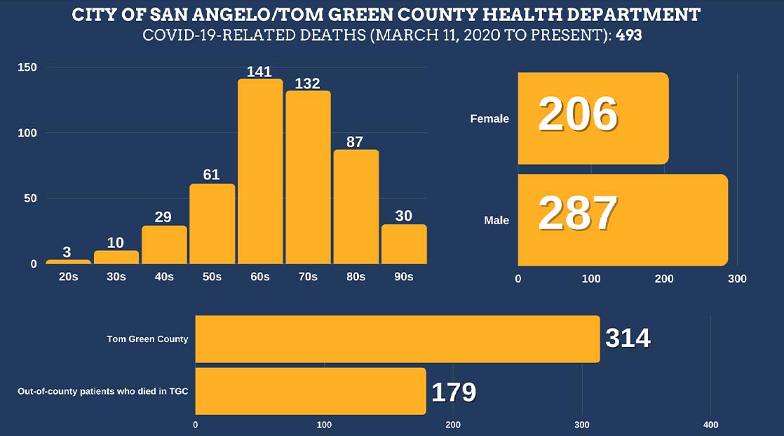 This brings the total deaths in Tom Green County to 493 –– 314 from Tom Green County and 179 from other counties.
