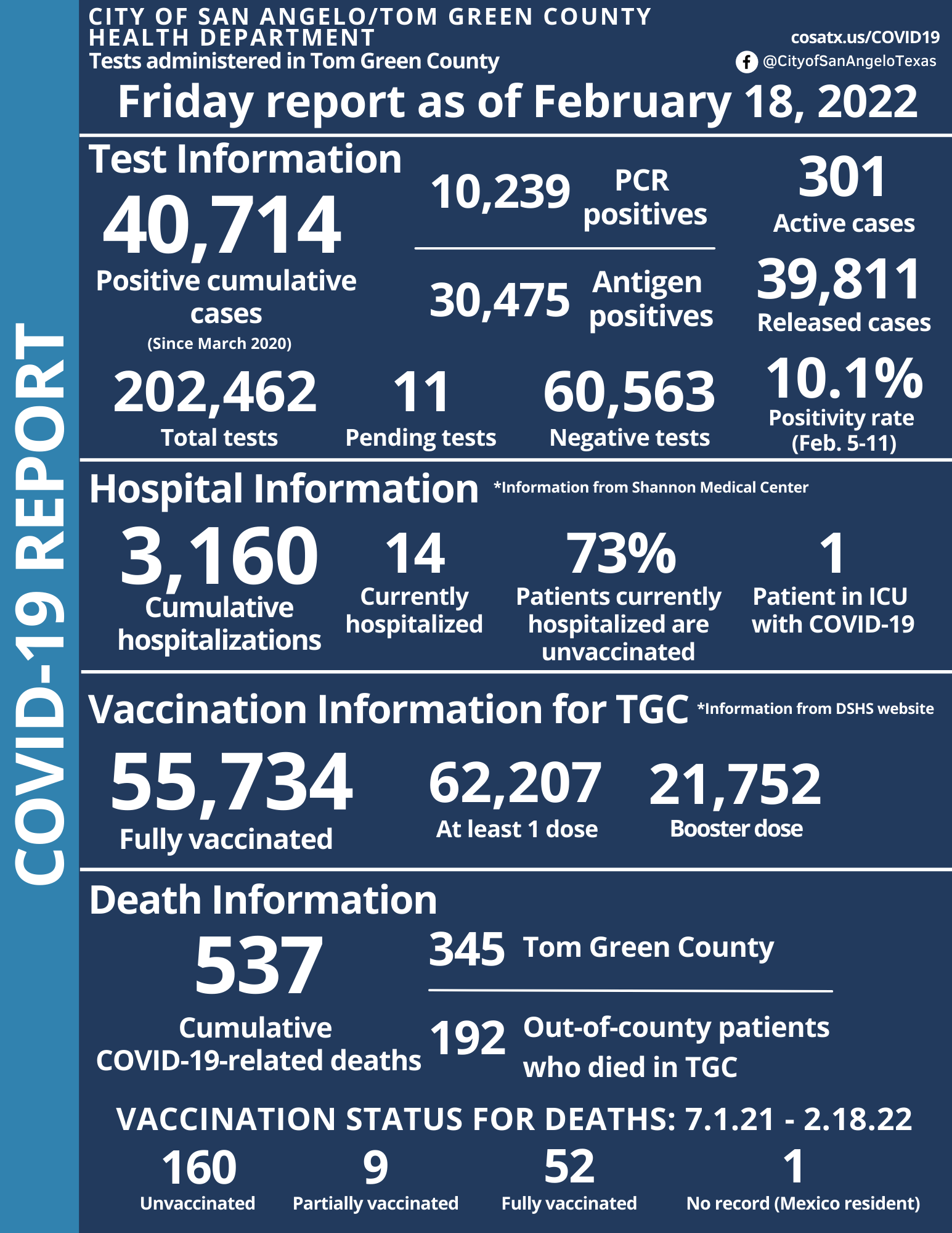SAN ANGELO, TX – The City of San Angelo Health Department on Friday reported another 15 positive Covid-19 infections.