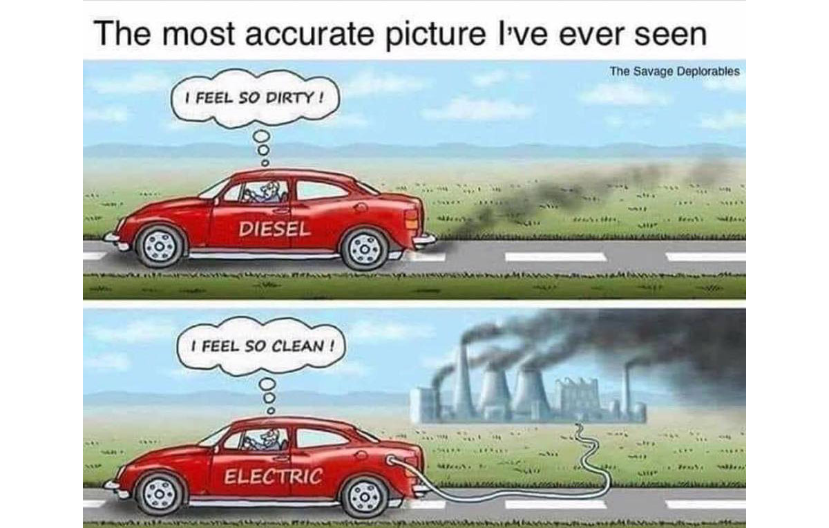 Ah, but you drive an electric car, so you’re not polluting the environment like the rest of us. Well, hold up there, Sunbeam. You might be surprised to learn that car was built using fossil fuels, transported using fossil fuels, and runs on fossil fuels. Most of the electricity America uses is generated by burning coal and natural gas. Wind and solar are still pretty much a joke.