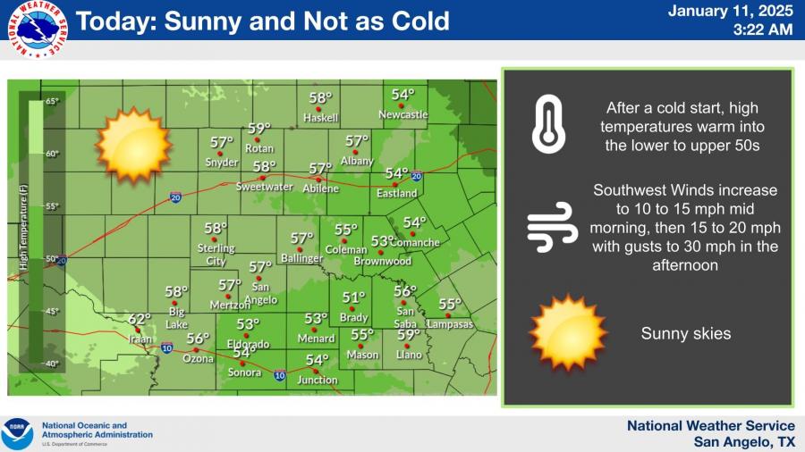 Saturday's forecast calls for sunny skies and highs in the 50s across much of West Central Texas. Winds from the southwest will pick up to 10-15 mph by mid-morning, with gusts reaching up to 30 mph in the afternoon.