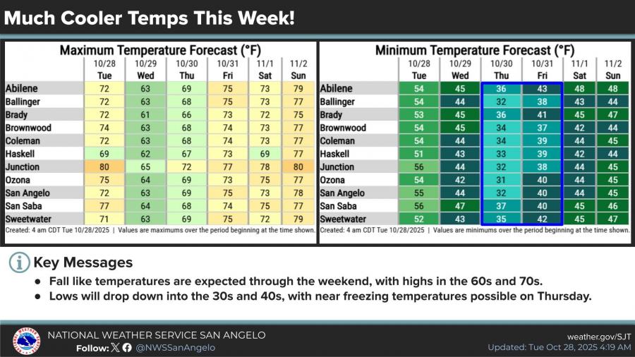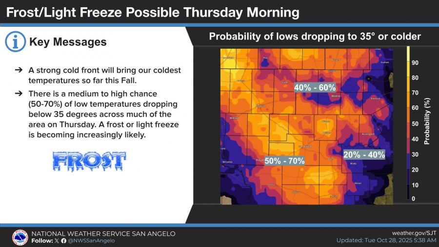 By Thursday morning, temperatures are forecast to drop into the 30s, bringing the season’s first frost or light freeze to portions of the region. The weather service estimates a 50 to 70 percent chance of lows dipping below 35 degrees across much of West Central Texas.