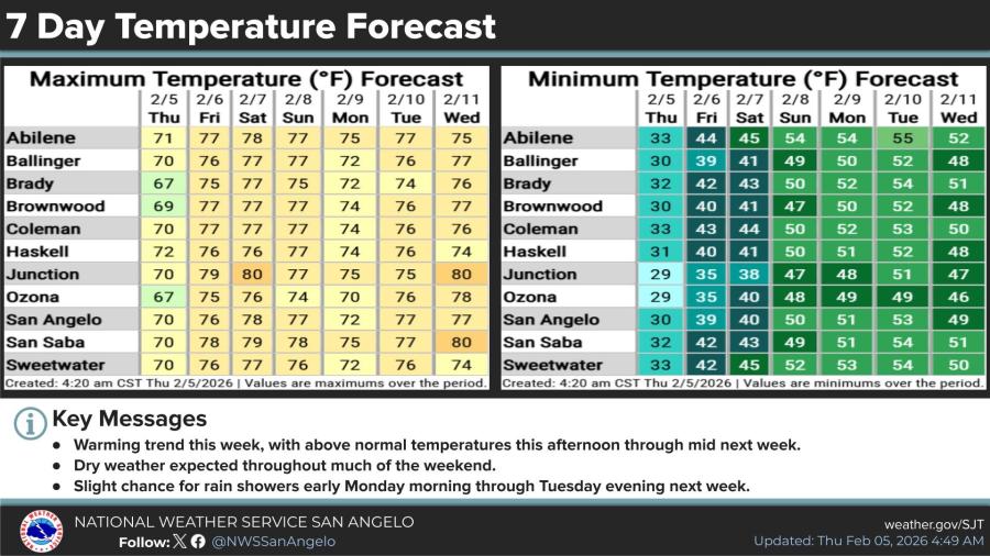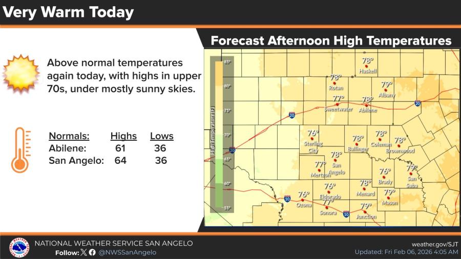 The National Weather Service in San Angelo forecasts afternoon highs ranging from 76 to 79 degrees across much of the region — the highest since Jan. 7 in some areas. Cities like San Angelo and Abilene are expected to reach the upper 70s to around 80 degrees, well above early February normals of 61-64 degrees.