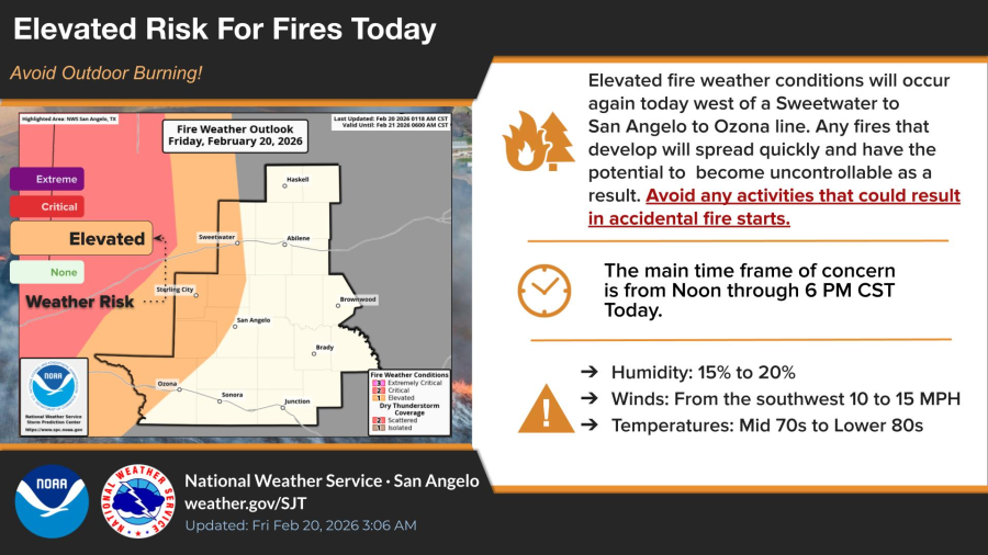 SAN ANGELO, TX — Dry weather will continue across West Texas with no rainfall expected through early next week, the National Weather Service in San Angelo said Friday, as elevated fire weather conditions return for the day.