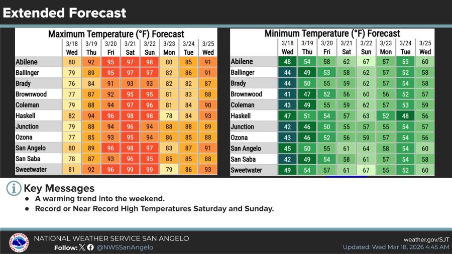 A significant warming trend is already underway. Extended forecasts show temperatures climbing from the low 80s Wednesday into the upper 90s by Friday, with Abilene reaching 97 Saturday and 98 Sunday, and San Angelo hitting 98 Saturday and 97 Sunday. Other area communities, including Sweetwater, Haskell and Ballinger, are also expected to see near-triple-digit highs Saturday and Sunday.
